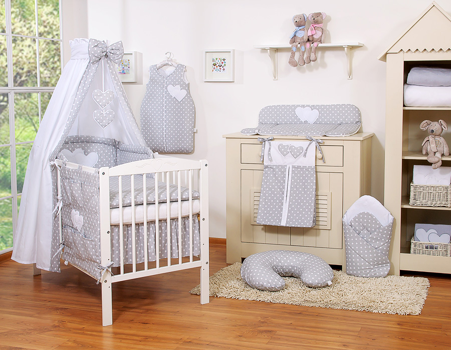 11-osainen vuodevaatesetti vauvalle + katosverho - Hanging Hearts