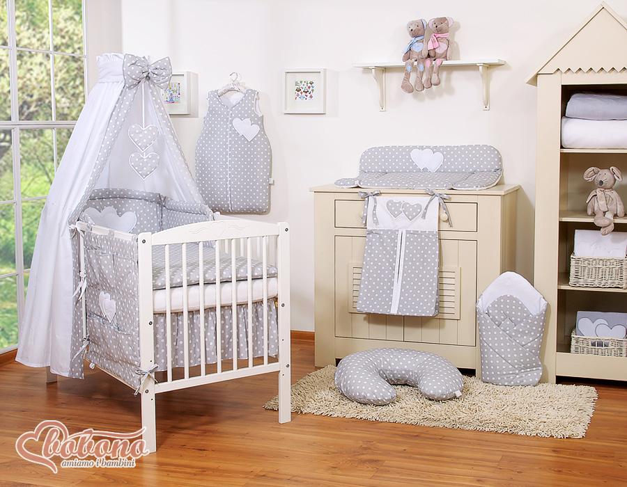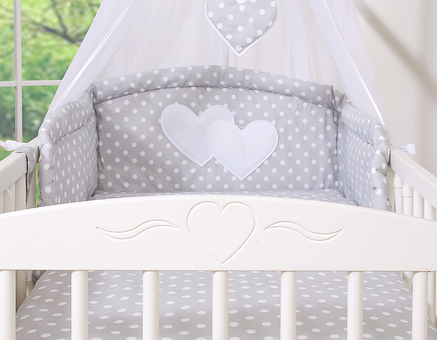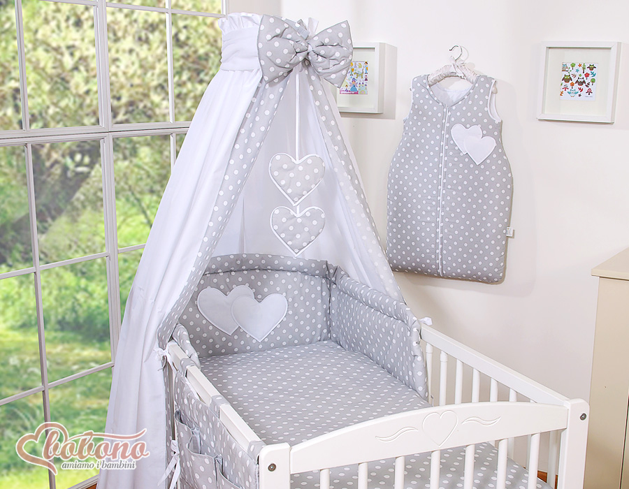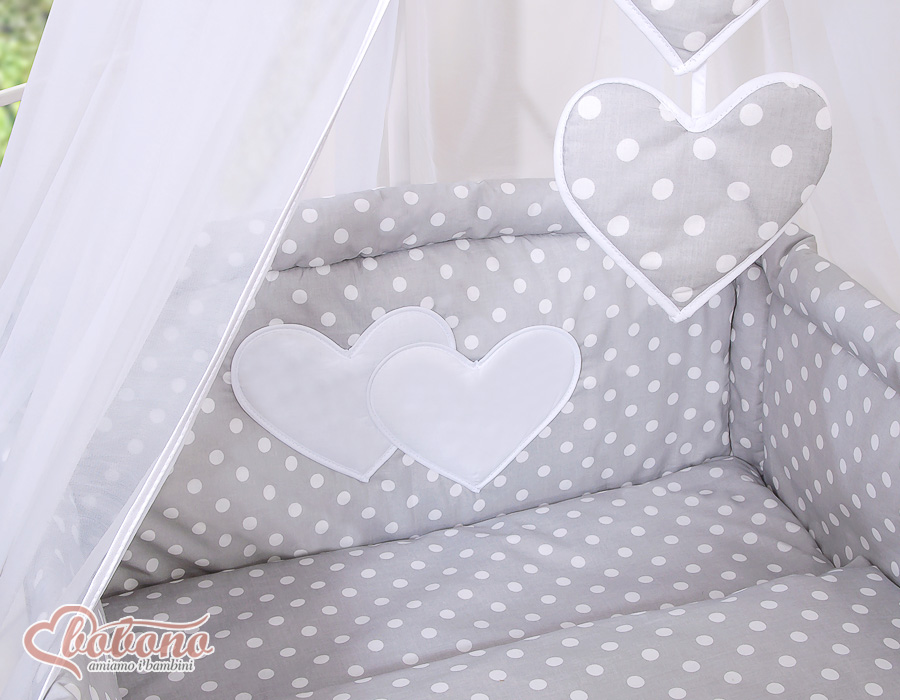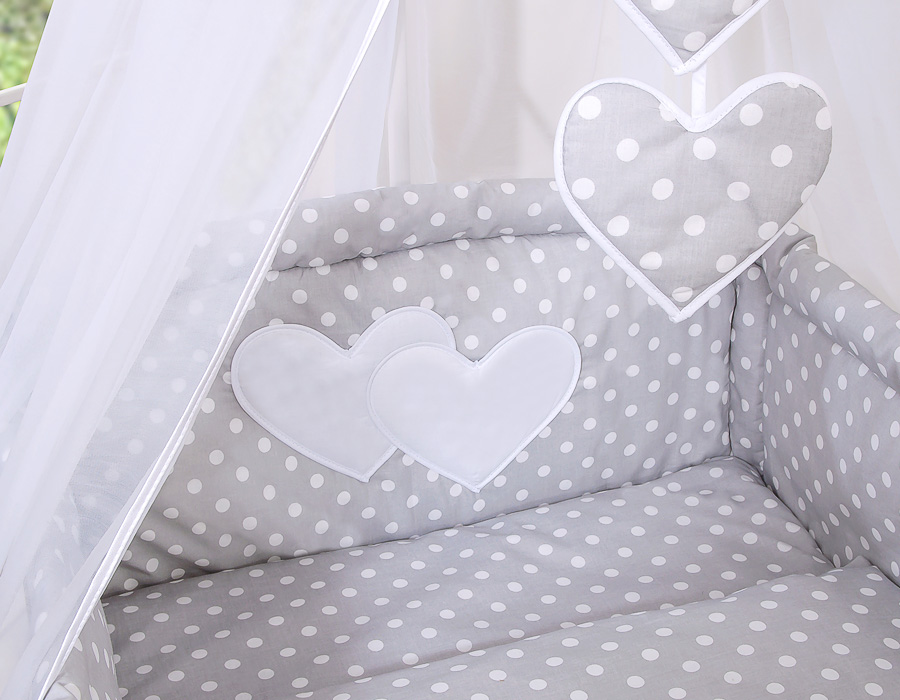 Etusivu » Vuodevaatesetit pinnasänkyyn » Vuodevaatesetit Sydämet » Vuodevaatesetit pinnasänkyyn 120cm Sydämet » 11-os Pussilakanasetti pinnasänkyyn Katosverho Sydämet » 11-osainen pussilakanasetti ja katosverho - Hanging Hearts Harmaa Valkoisilla Pilkuilla
