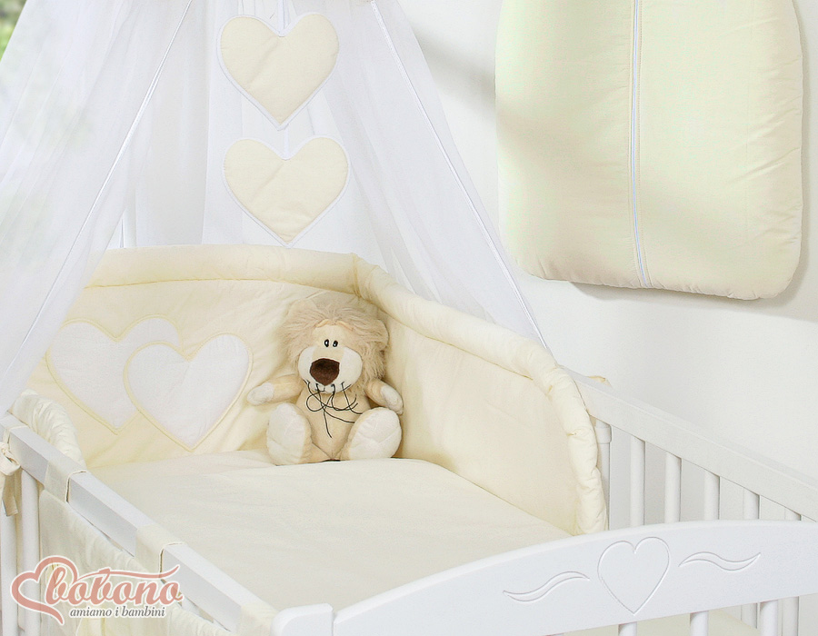 Etusivu » Vuodevaatesetit pinnasänkyyn » Vuodevaatesetit Sydämet » Vuodevaatesetit pinnasänkyyn 120cm Sydämet » 11-os Pussilakanasetti pinnasänkyyn Katosverho Sydämet » 11-osainen pussilakanasetti ja katosverho - Hanging Hearts Norsunluu