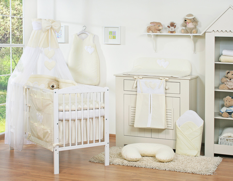 11-osainen vuodevaatesetti vauvalle + katosverho - Hanging Hearts