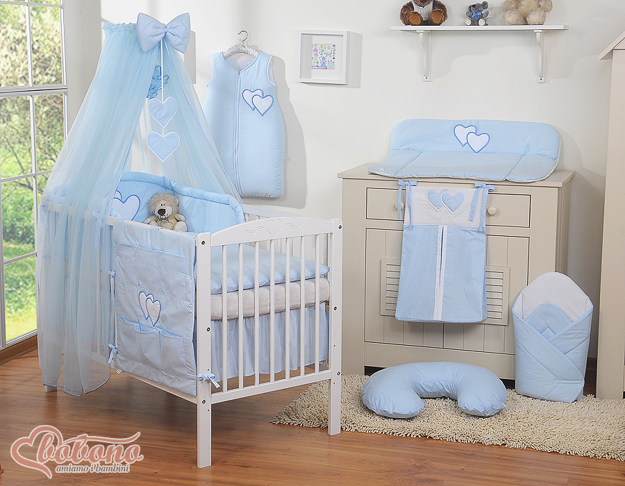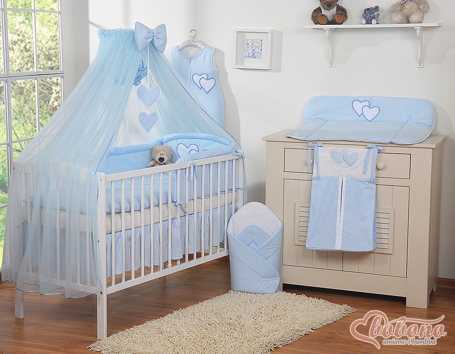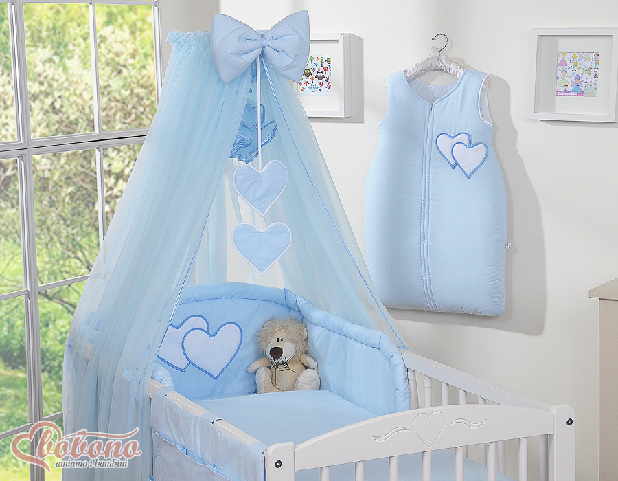 11-osainen vauvan pussilakanasetti ja hyttysverkko - Hanging Hearts Sininen
