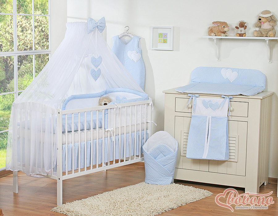 11-osainen vauvan vuodevaatesetti + katosverho - Leijuvat Sydämet Sininen Ruutukuvio