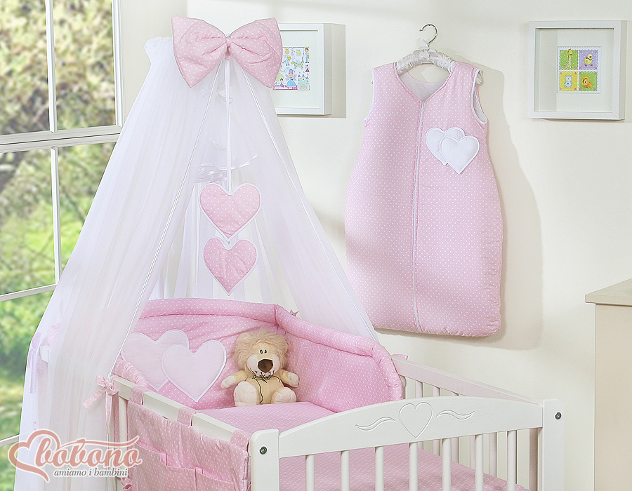 Etusivu » Vuodevaatesetit pinnasänkyyn » Vuodevaatesetit Sydämet » Vuodevaatesetit pinnasänkyyn 140cm -Sydämet » 11-os Pussilakanasetti pinnasänkyyn hyttysverkko Sydämet » 11-osainen vauvan vuodevaatesetti + katosverho - Leijuvat Sydämet Vaaleanpunainen Valkoisilla Pilkuilla
