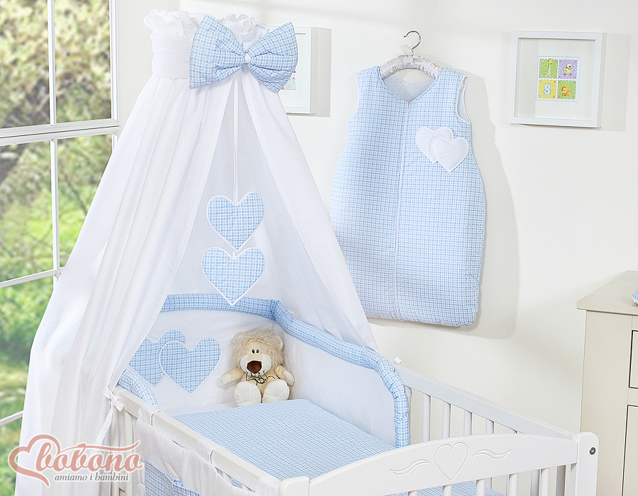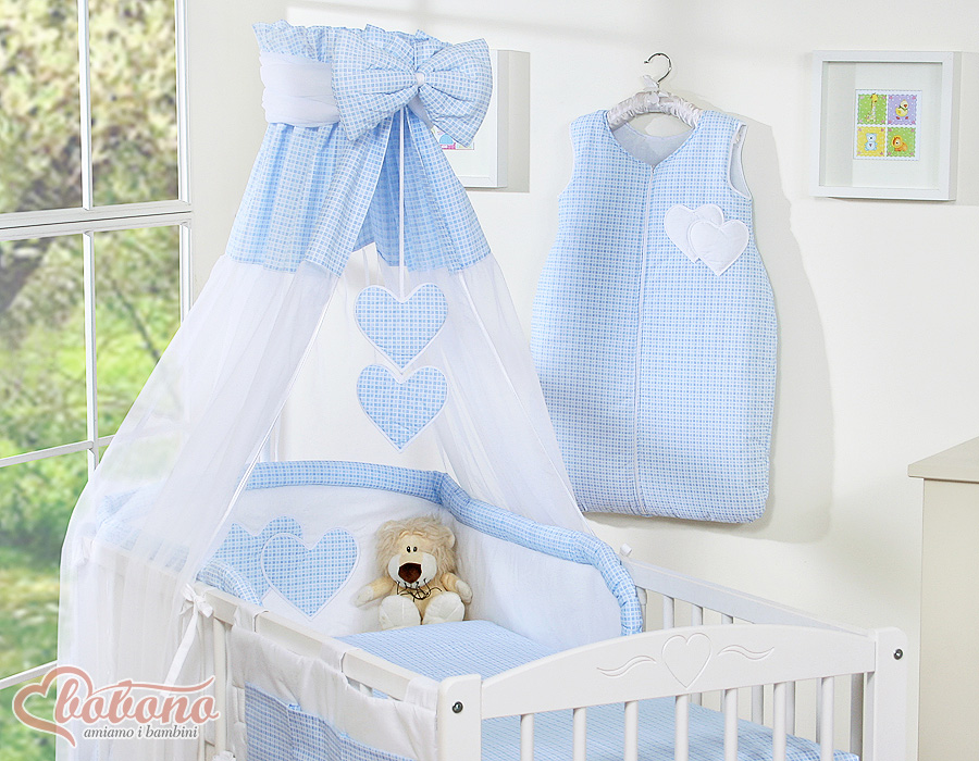 Etusivu » Vuodevaatesetit pinnasänkyyn » Vuodevaatesetit Sydämet » Vuodevaatesetit pinnasänkyyn 120cm Sydämet » 11-os Pussilakanasetti pinnasänkyyn Katosverho Sydämet » 11-osainen vuodevaatesetti ja hyttysverkko - Leijuvat Sydämet Sininen Ruutukuvio