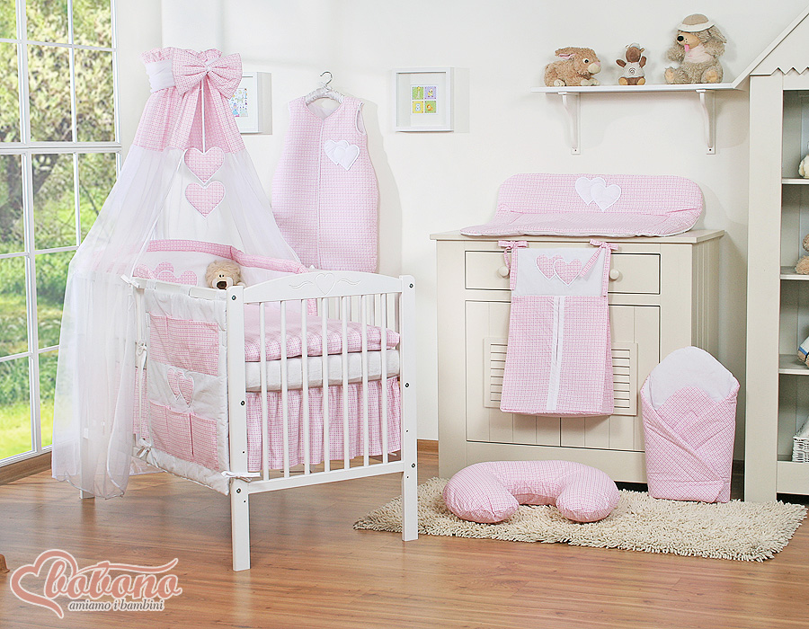 11-osainen vuodevaatesetti vauvalle + katosverho - Hanging Hearts