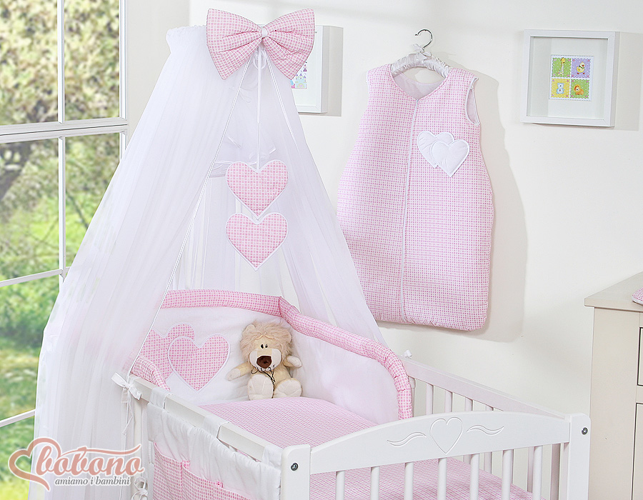 Etusivu » Vuodevaatesetit pinnasänkyyn » Vuodevaatesetit Sydämet » Vuodevaatesetit pinnasänkyyn 140cm -Sydämet » 11-os Pussilakanasetti pinnasänkyyn hyttysverkko Sydämet » 11-osainen vuodevaatesetti ja hyttysverkko - Leijuvat Sydämet Vaaleanpunainen Ruutukuvio
