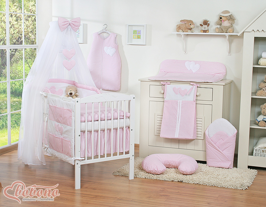 11-osainen vuodevaatesetti vauvalle + hyttysverkko - Hanging Hearts