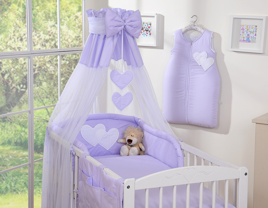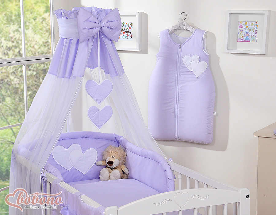 Etusivu » Vuodevaatesetit pinnasänkyyn » Vuodevaatesetit Sydämet » Vuodevaatesetit pinnasänkyyn 120cm Sydämet » 11-os Pussilakanasetti pinnasänkyyn Katosverho Sydämet » 11-osainen vuodevaatesetti ja hyttysverkko - Leijuvat Sydämet Violetti