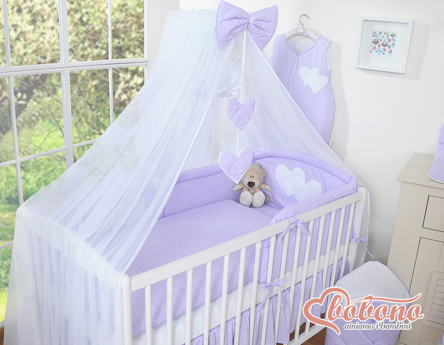 Etusivu » Vuodevaatesetit pinnasänkyyn » Vuodevaatesetit Sydämet » Vuodevaatesetit pinnasänkyyn 120cm Sydämet » 11-os Pussilakanasetti pinnasänkyyn hyttysverho Sydämet » 11-osainen vuodevaatesetti ja hyttysverkko - Leijuvat Sydämet Violetti Valkoisilla Pilkuilla