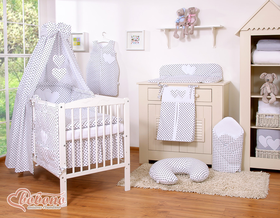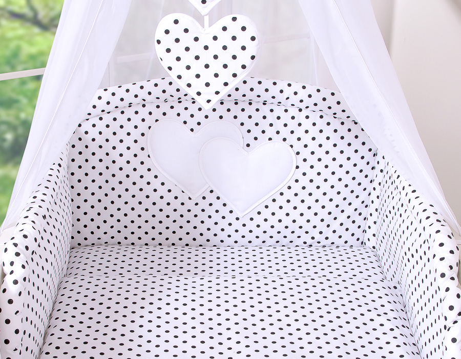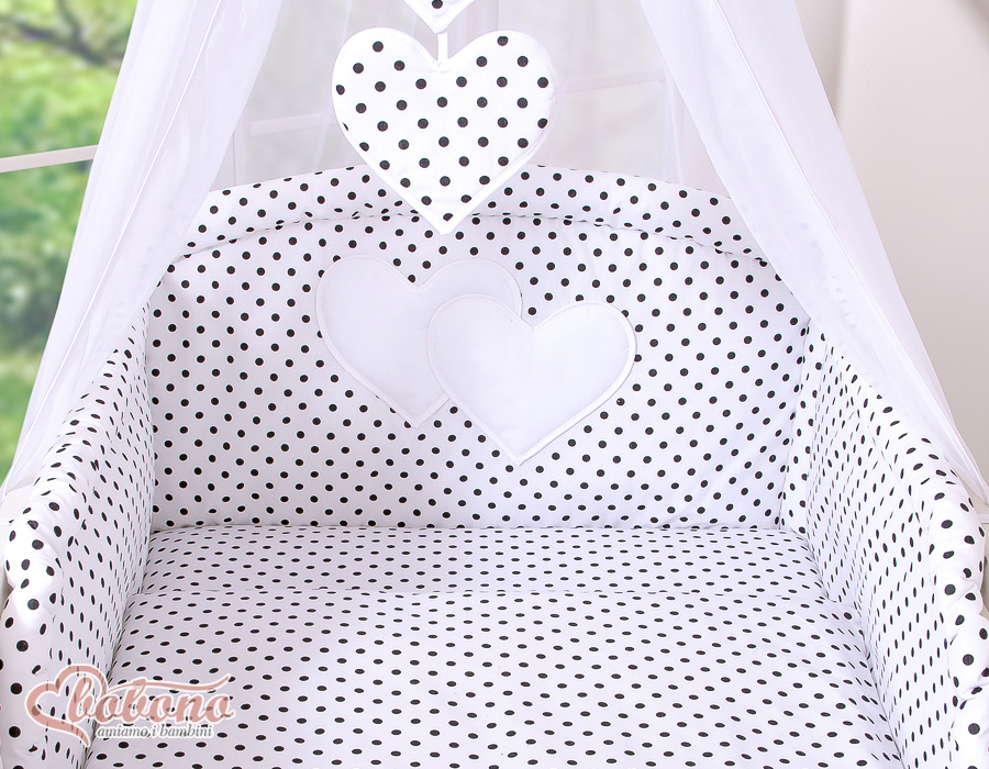 Etusivu » Vuodevaatesetit pinnasänkyyn » Vuodevaatesetit Sydämet » Vuodevaatesetit pinnasänkyyn 120cm Sydämet » 11-os Pussilakanasetti pinnasänkyyn Katosverho Sydämet » 11-osainen vuodevaatesetti + katosverho - Leijuvat Sydämet Musta Valkoisilla Pilkuilla
