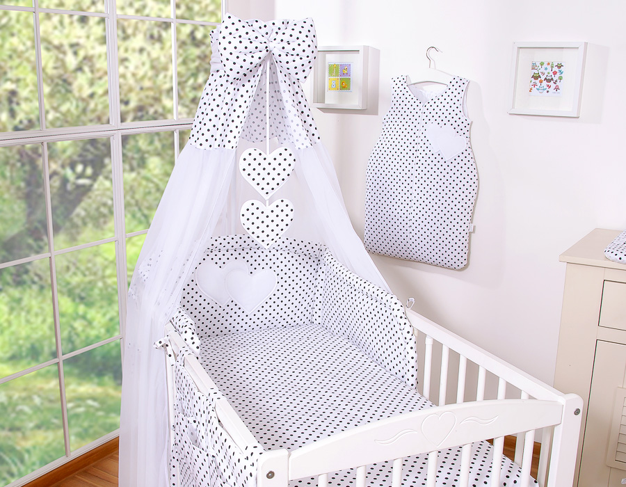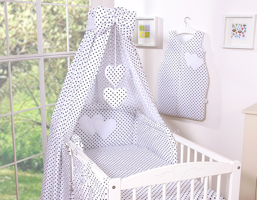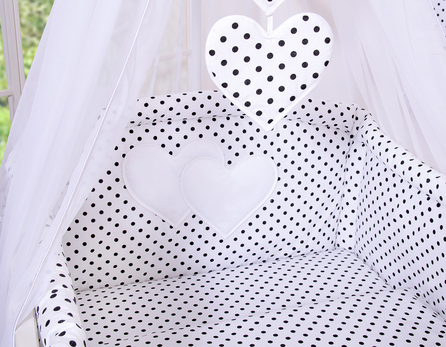11-osainen vuodevaatesetti + katosverho - Leijuvat Sydämet Musta Valkoisilla Pilkuilla