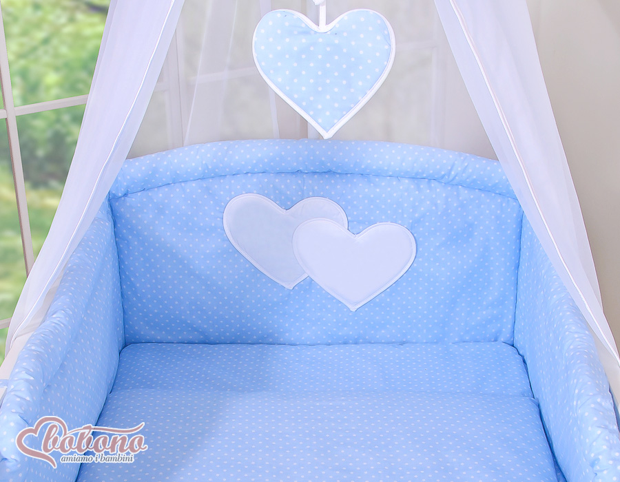 11-osainen vuodevaatesetti + katosverho - Leijuvat Sydämet Sininen Valkoisilla Pilkuilla