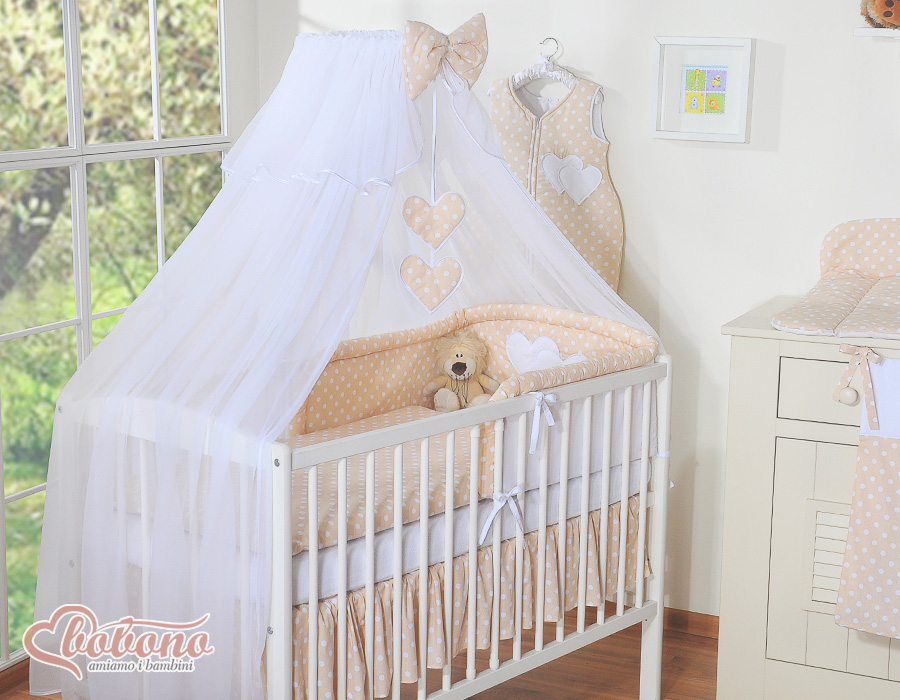 11-osainen vuodevaatesetti vauvalle + hyttysverkko - Hanging Hearts Beige Valkoisilla Pilkuilla