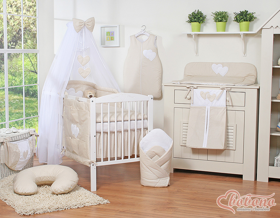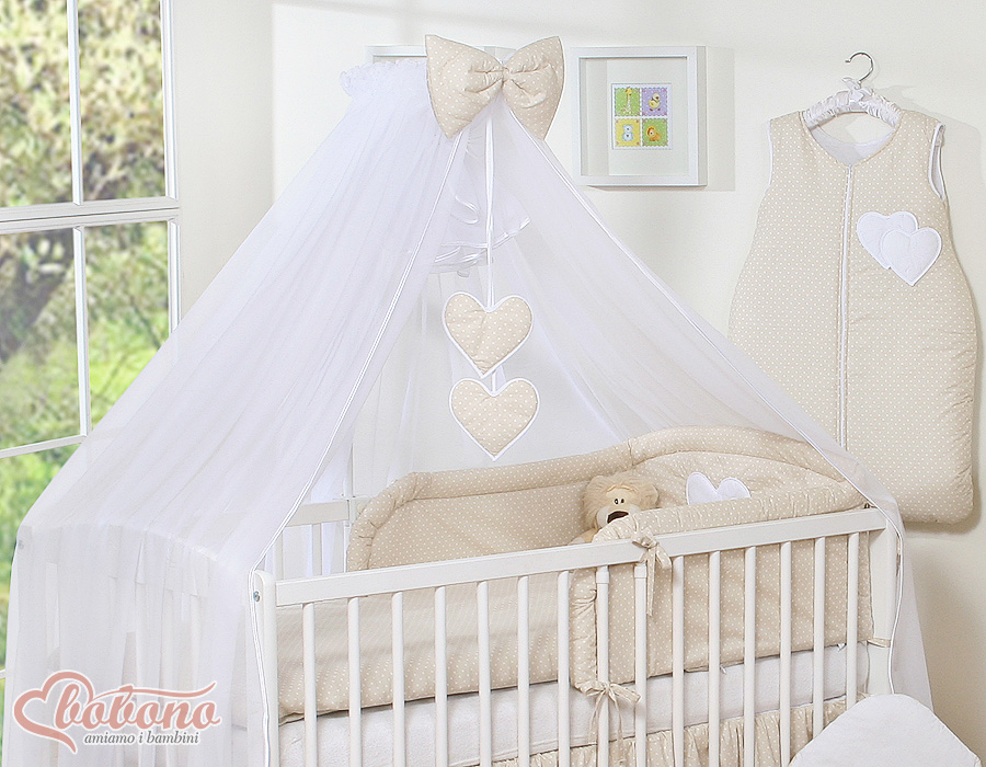 11-osainen vuodevaatesetti vauvalle + hyttysverkko - Hanging Hearts Beige Valkoisilla Pilkuilla