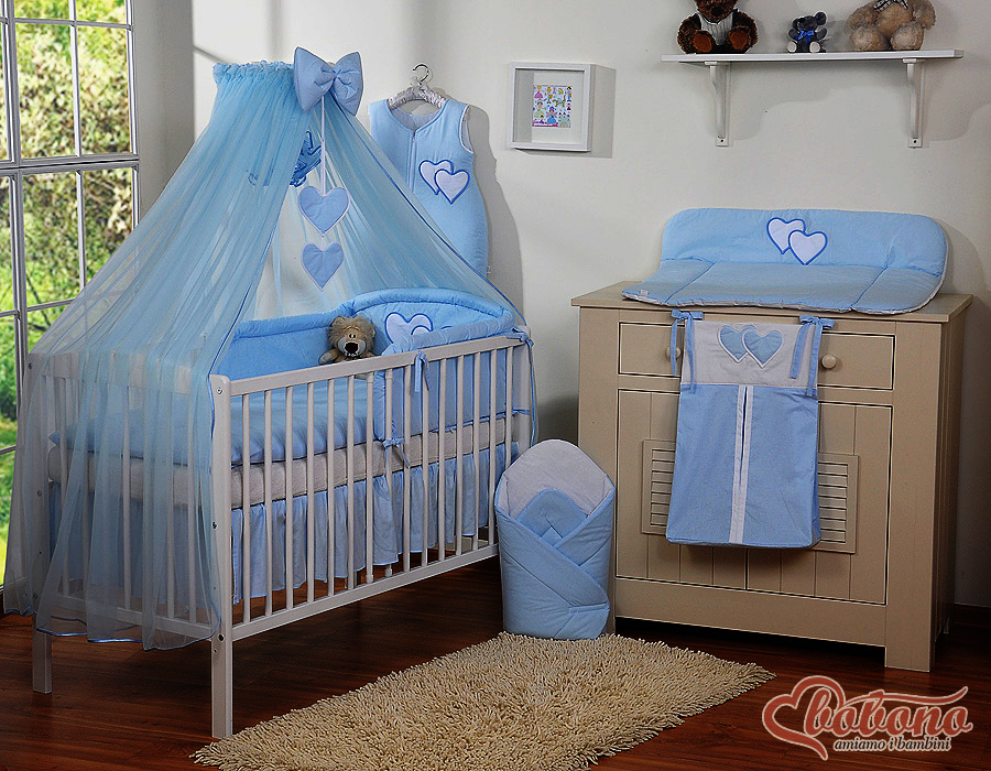 11-osainen vuodevaatesetti vauvalle + hyttysverkko - Hanging Hearts Sininen