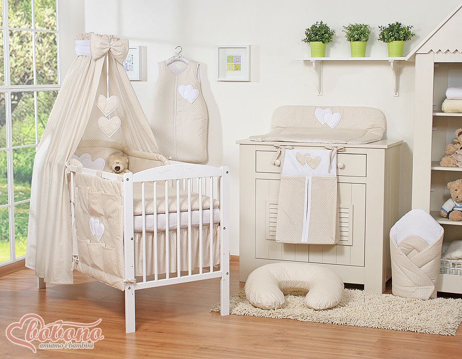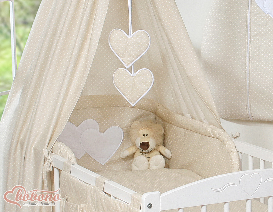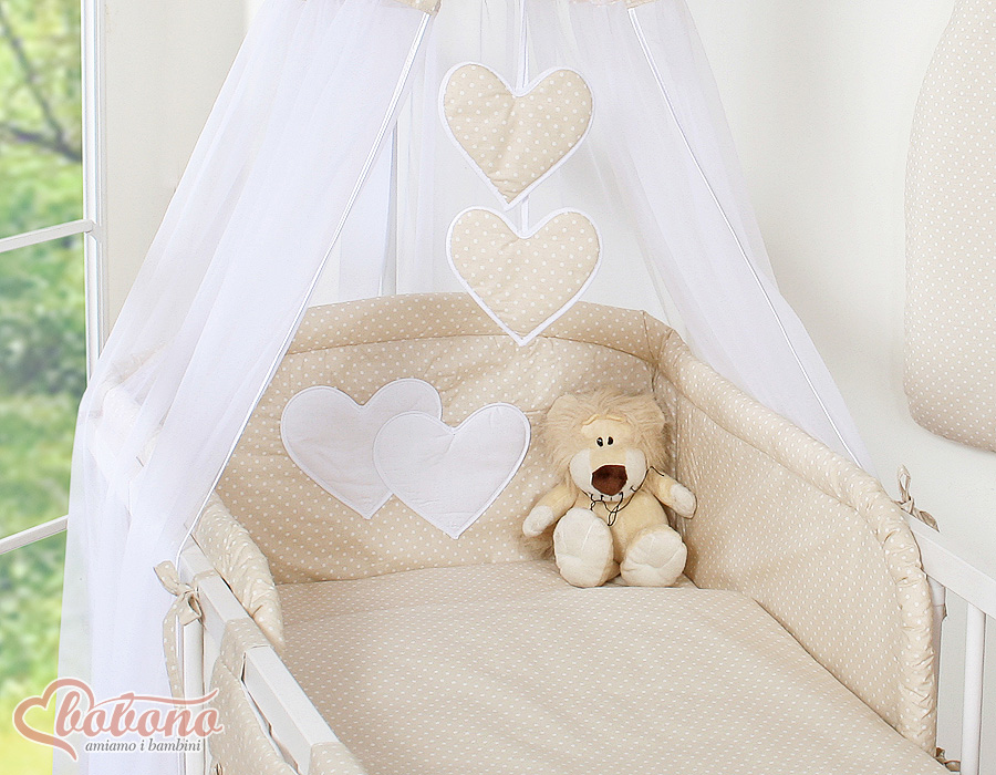 11-osainen vuodevaatesetti vauvalle + katosverho - Hanging Hearts Beige Valkoisilla Pilkuilla
