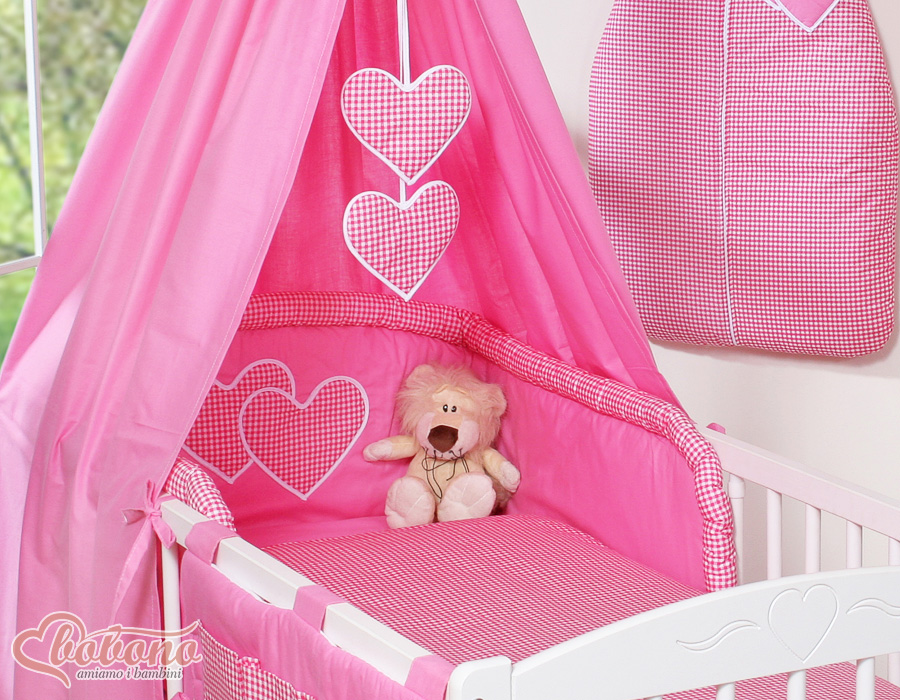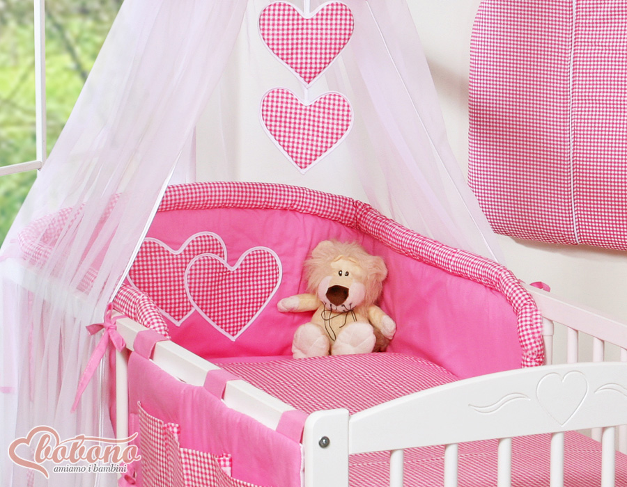 11-osainen vuodevaatesetti vauvalle + katosverho - Hanging Hearts Vaaleanpunainen Valkoisilla Pilkuilla180.09 €