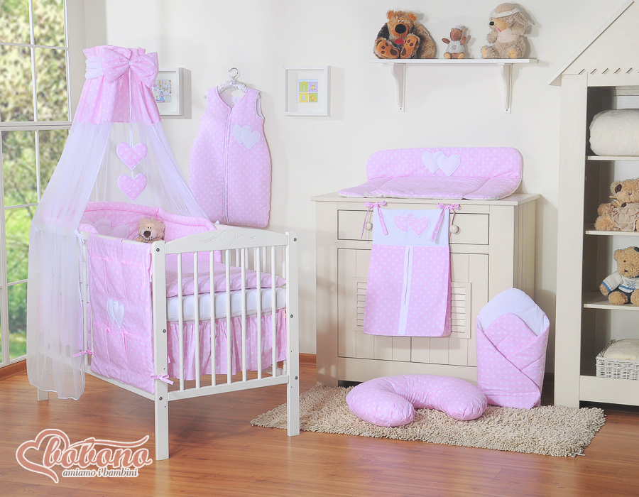 11-osainen vuodevaatesetti vauvalle + katosverho - Hanging Hearts Vaaleanpunainen Valkoisilla Pilkuilla