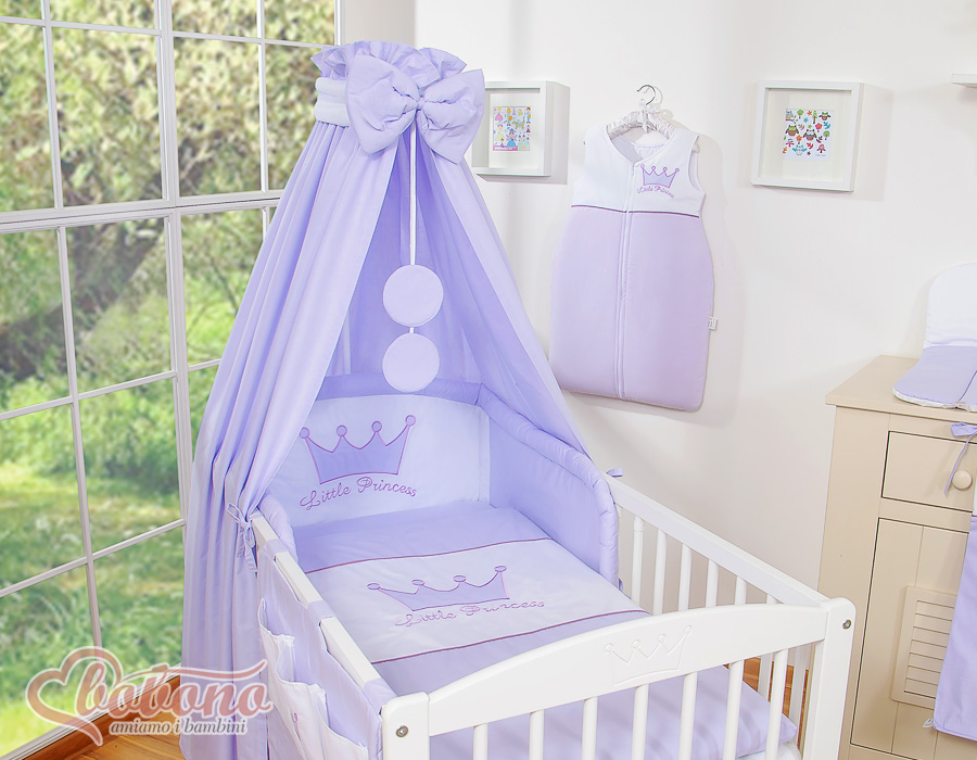 11-osainen vuodevaatesetti vauvalle + katosverho - Little Prince/Princess Violetti