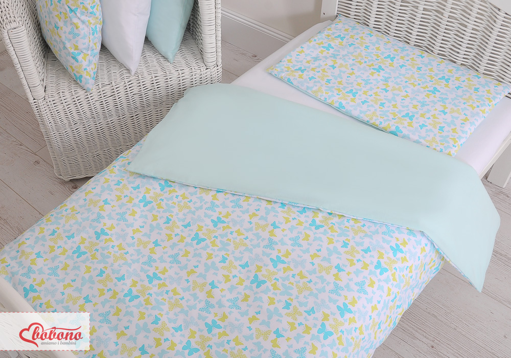 Etusivu » Vuodevaatesetit pinnasänkyyn » Lasten Pussilakanasetti » Pussilakanasetti 100x135cm MINI » 2-osainen pussilakanasetti - 100x135 Mini - Sininen Perhoset