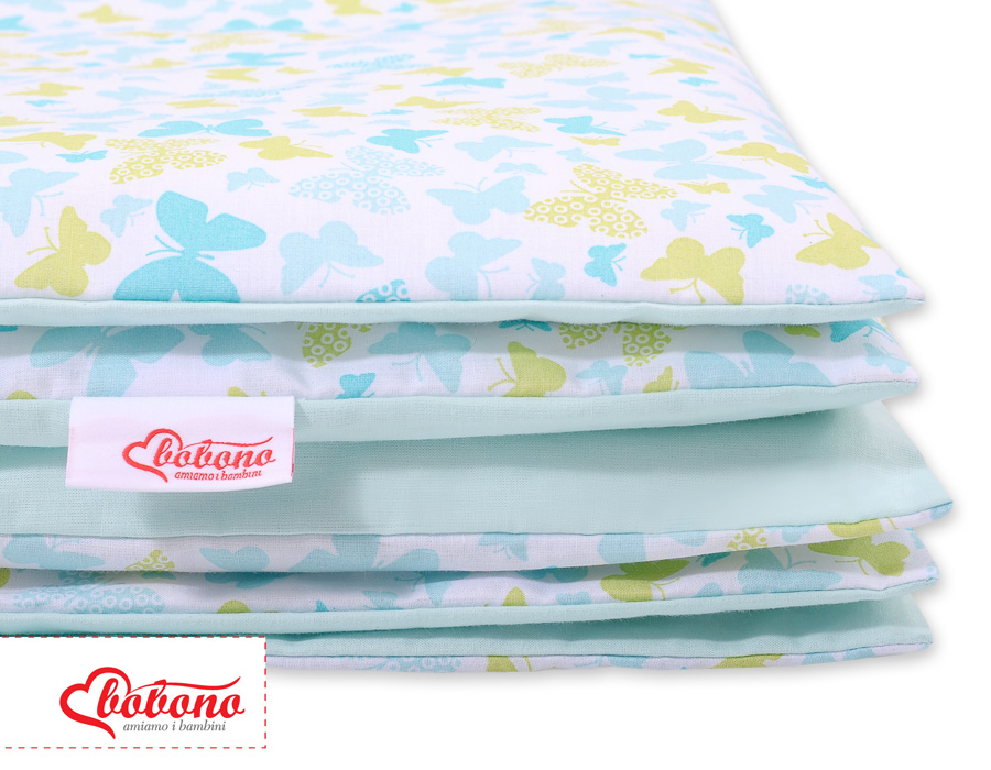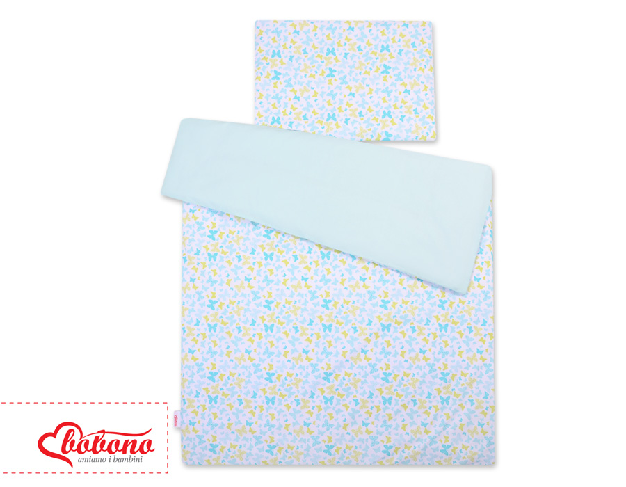 Etusivu » Vuodevaatesetit pinnasänkyyn » Lasten Pussilakanasetti » Pussilakanasetti 140x200cm JUNIOR » 2-osainen pussilakanasetti lapselle 140x200 Junior - Sininen Perhoset