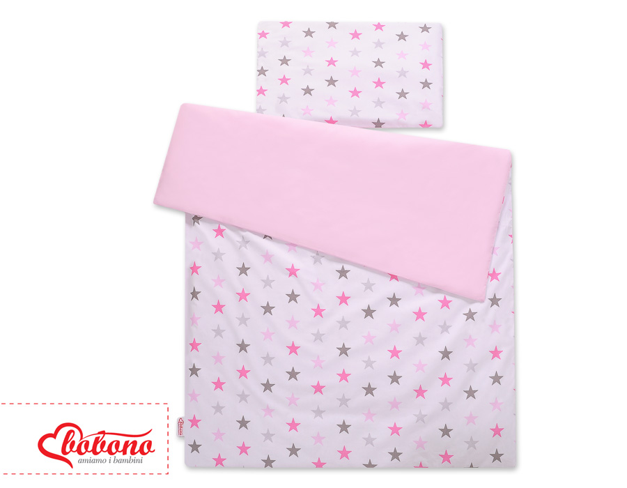 Etusivu » Vuodevaatesetit pinnasänkyyn » Lasten Pussilakanasetti » Pussilakanasetti 100x135cm MINI » 2-osainen pussilakanasetti vauvalle - 100x135 Mini - Vaaleanpunainen Harmaa Tähdillä