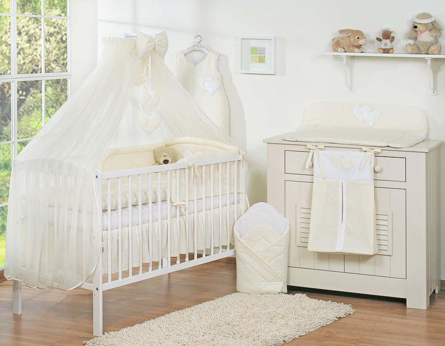 Etusivu » Vuodevaatesetit pinnasänkyyn » Vuodevaatesetit Sydämet » Vuodevaatesetit pinnasänkyyn 120cm Sydämet » 5-os Pussilakanasetti pinnasänkyyn hyttysverho Sydämet » 5-osainen pussilakanasetti ja suojaverho - Hanging Hearts Norsunluu