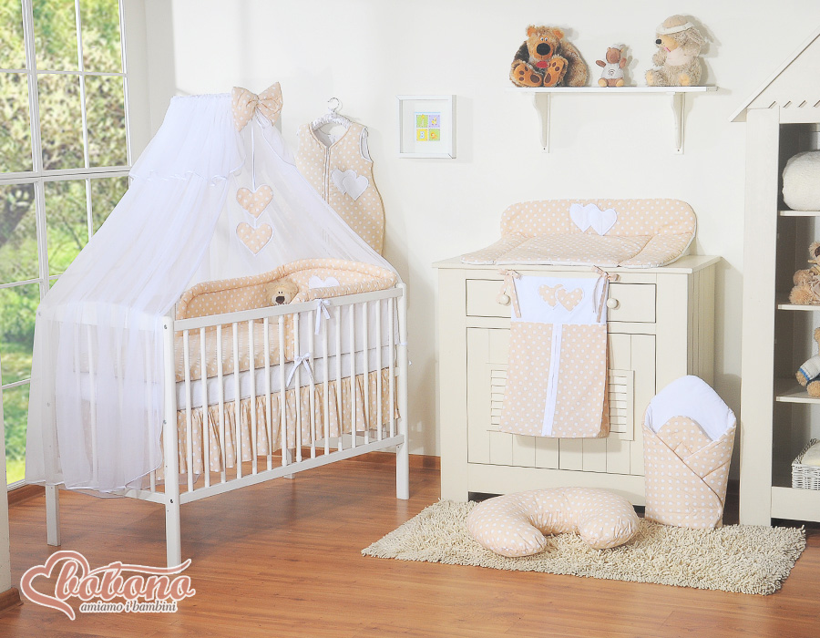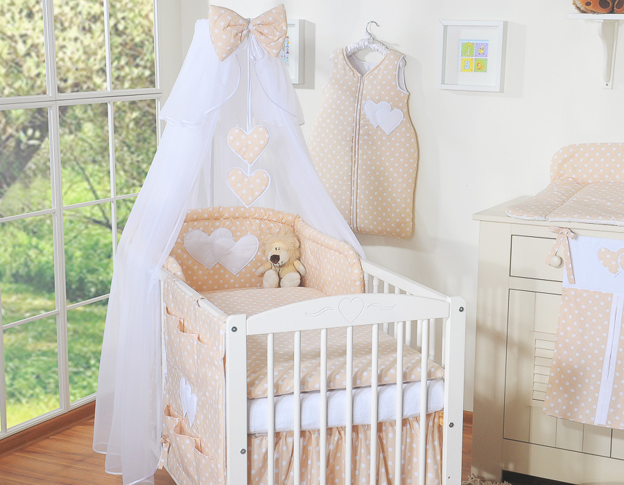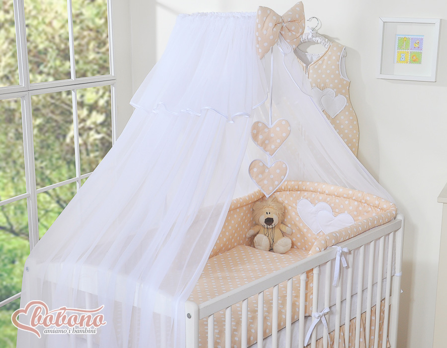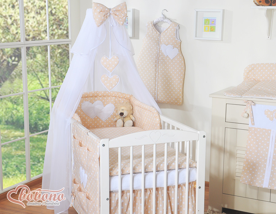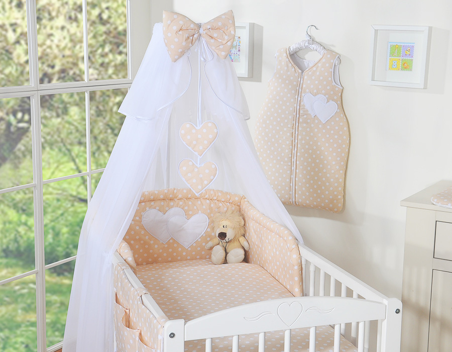 Etusivu » Vuodevaatesetit pinnasänkyyn » Vuodevaatesetit Sydämet » Vuodevaatesetit pinnasänkyyn 120cm Sydämet » 5-os Pussilakanasetti pinnasänkyyn hyttysverho Sydämet » 5-osainen vuodevaatesetti + hyttysverkko - Leijuvat Sydämet Beige Valkoisilla Pilkuilla