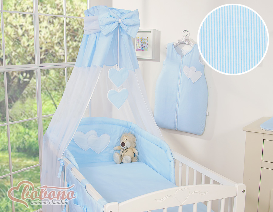 5-osainen vuodevaatesetti ja katosverho - Leijuvat Sydämet Sininen Raidat