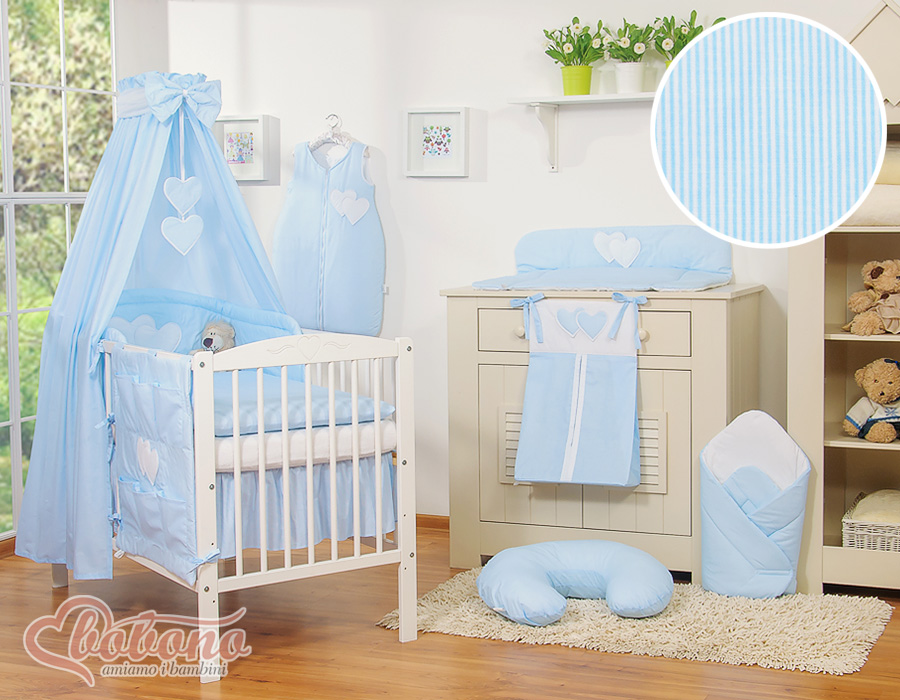 Etusivu » Vuodevaatesetit pinnasänkyyn » Vuodevaatesetit Sydämet » Vuodevaatesetit pinnasänkyyn 120cm Sydämet » 5-os Pussilakanasetti pinnasänkyyn Katosverho Sydämet » 5-osainen vuodevaatesetti ja katosverho - Leijuvat Sydämet Sininen Raidat