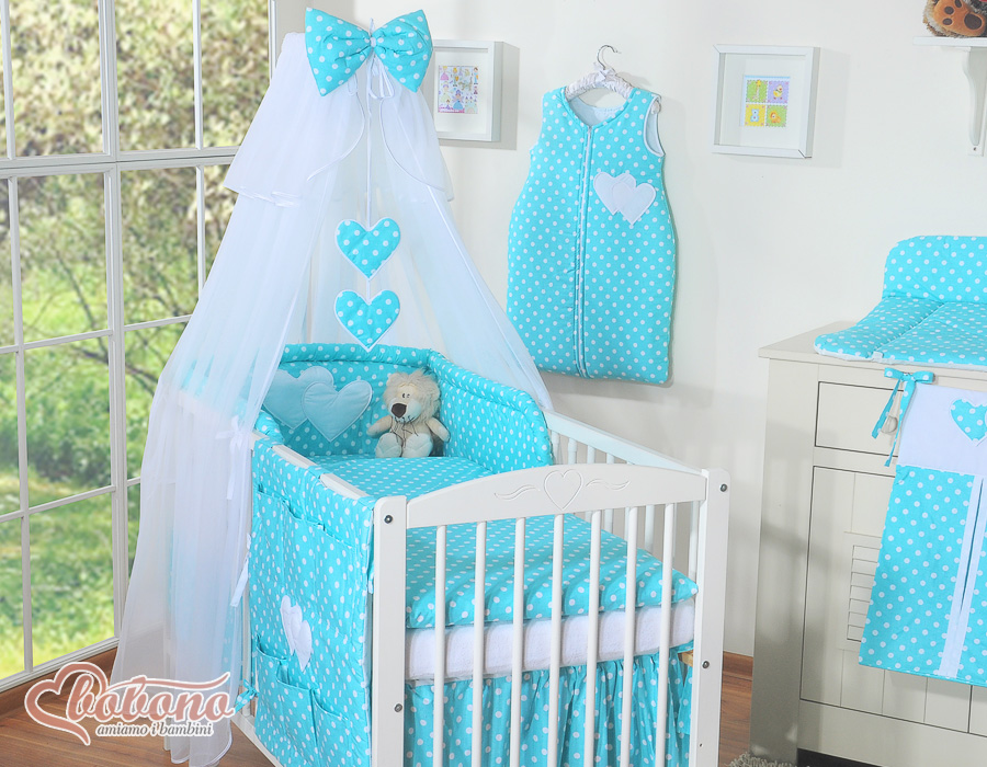Etusivu » Vuodevaatesetit pinnasänkyyn » Vuodevaatesetit Sydämet » Vuodevaatesetit pinnasänkyyn 120cm Sydämet » 5-os Pussilakanasetti pinnasänkyyn hyttysverho Sydämet » 5-osainen vuodevaatesetti ja katosverho - Leijuvat Sydämet Turkoosi Valkoisilla Pilkuilla