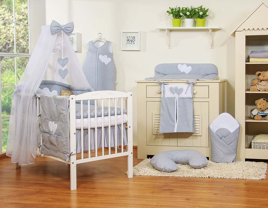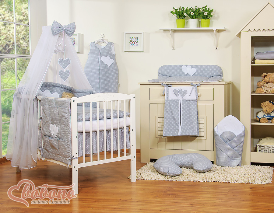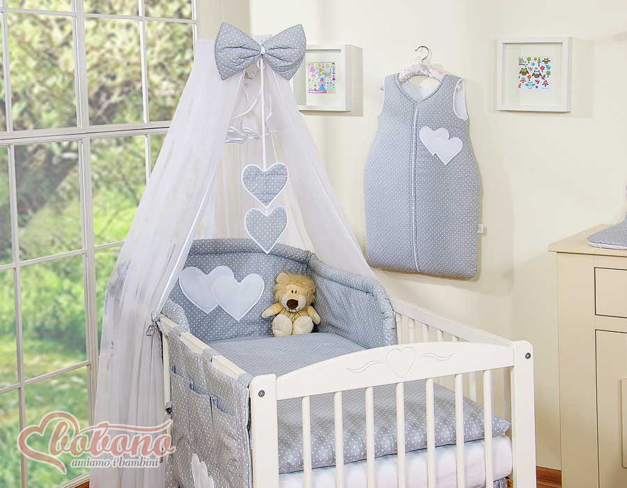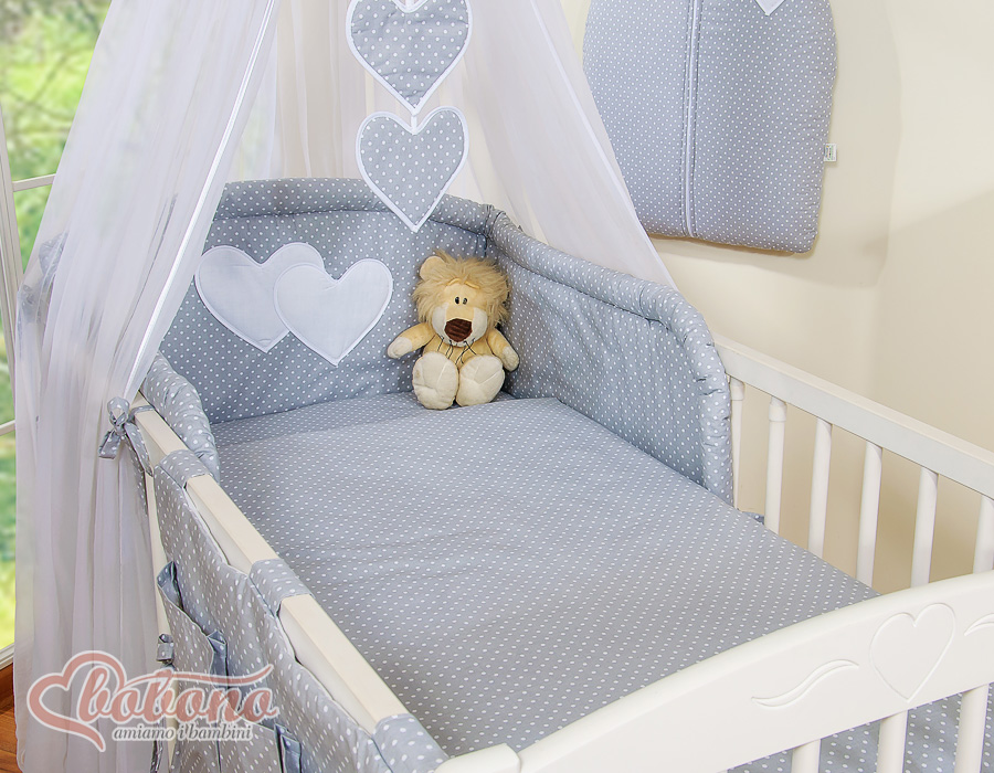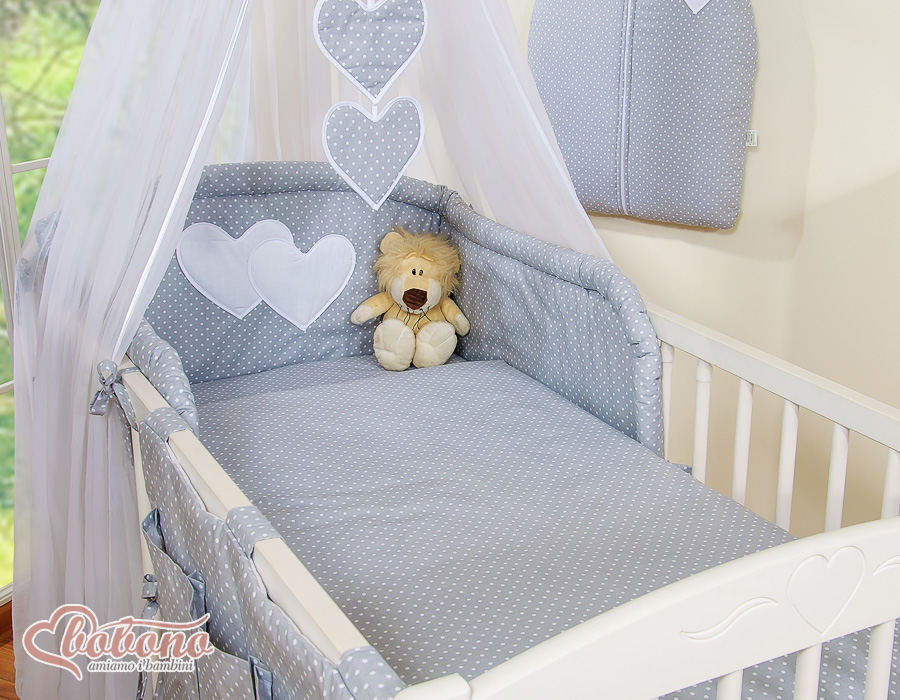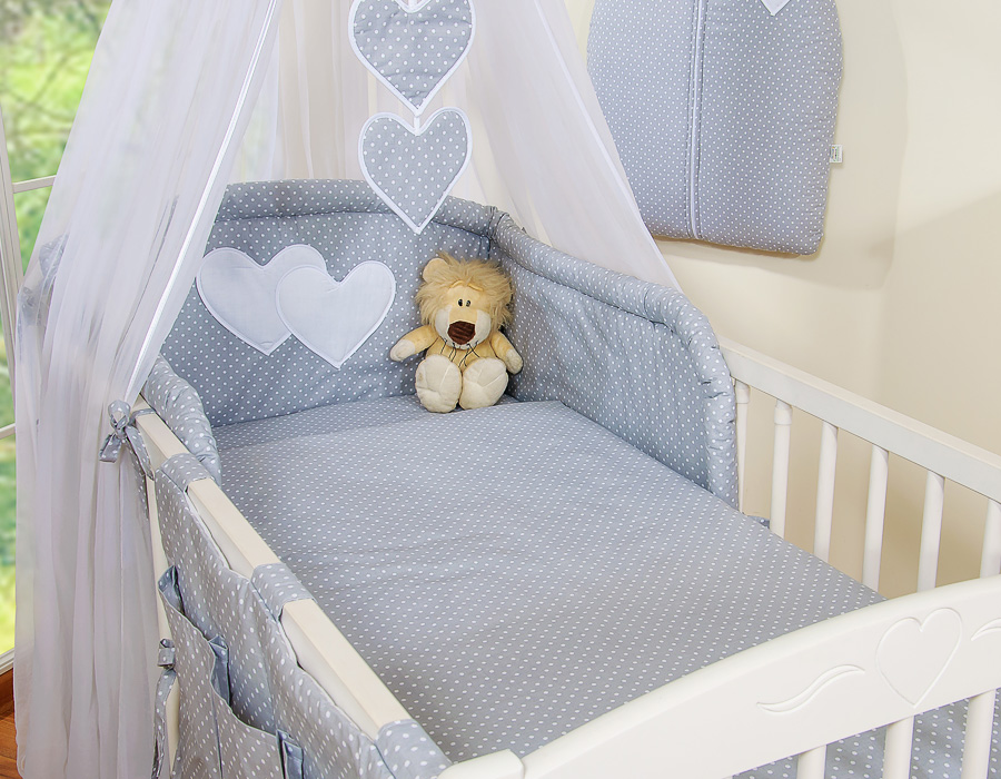 5-osainen vuodevaatesetti vauvalle + hyttysverkko - Hanging Hearts Harmaa Valkoisilla Pilkuilla