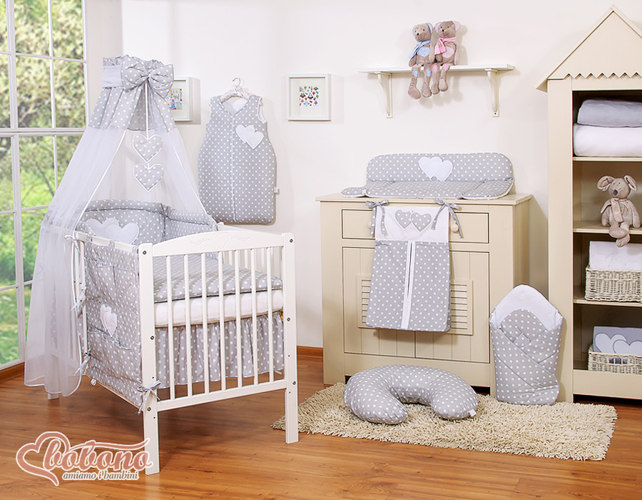 5-osainen vuodevaatesetti vauvalle + katosverho - Hanging Hearts Harmaa Valkoisilla Pilkuilla