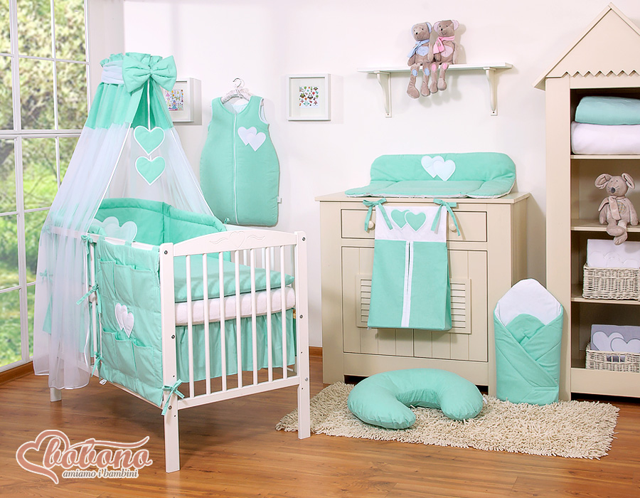 Etusivu » Vuodevaatesetit pinnasänkyyn » Vuodevaatesetit Sydämet » Vuodevaatesetit pinnasänkyyn 120cm Sydämet » 5-os Pussilakanasetti pinnasänkyyn Katosverho Sydämet » 5-osainen vuodevaatesetti vauvalle + katosverho - Hanging Hearts Minttu