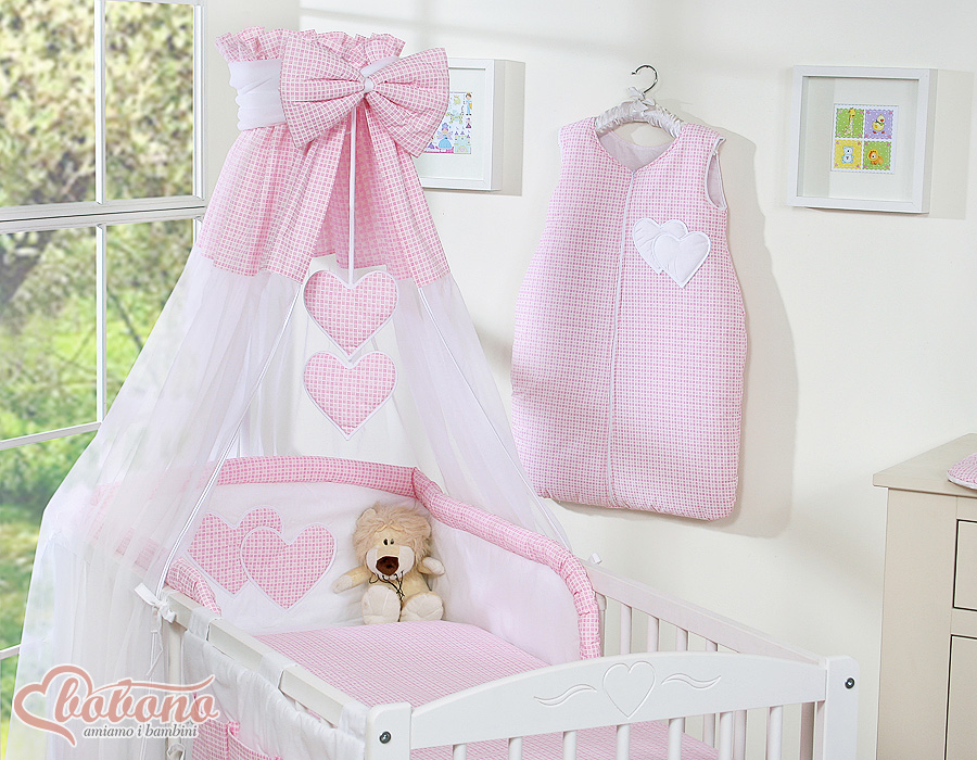 5-osainen vuodevaatesetti vauvalle + katosverho - Hanging Hearts Vaaleanpunainen Valkoisilla Pilkuilla85.13 €