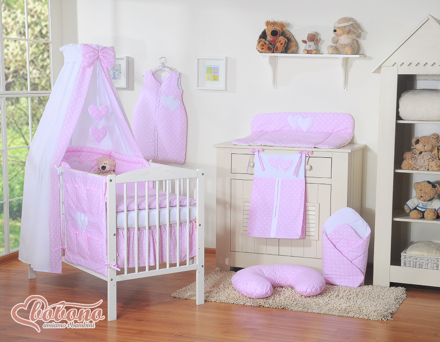 5-osainen vuodevaatesetti vauvalle + katosverho - Hanging Hearts Vaaleanpunainen Valkoisilla Pilkuilla