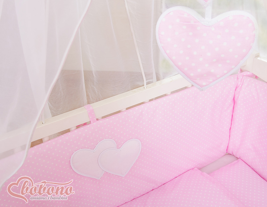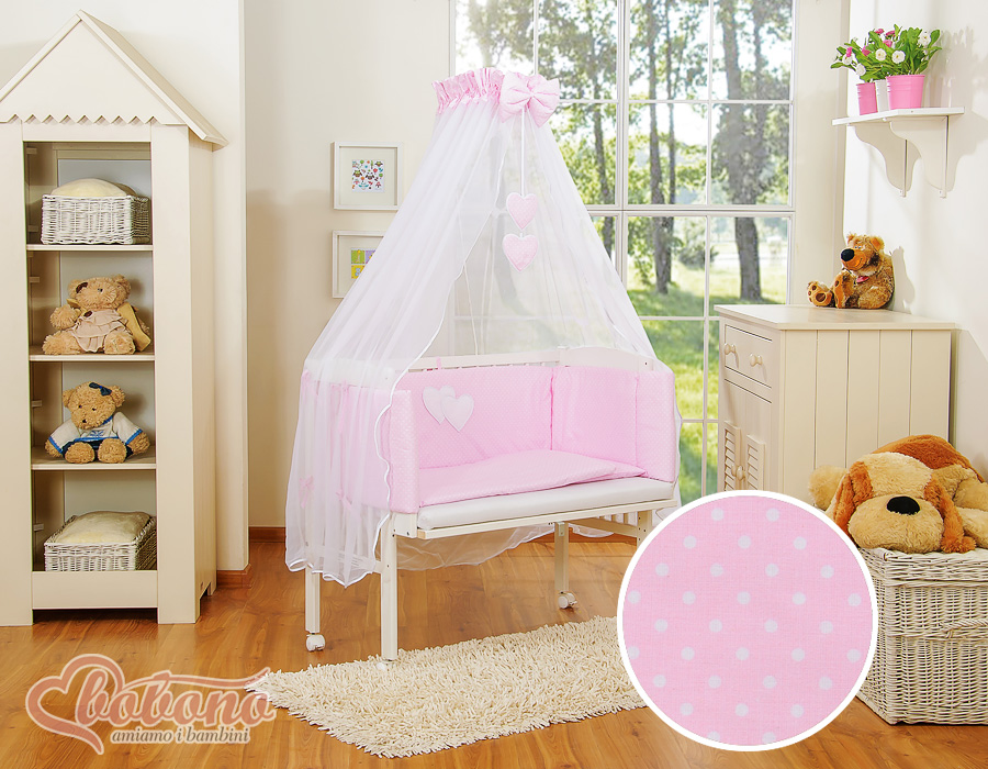 Etusivu » Pinnasänkyyn 120x60 cm » Vauvan sivusänky » Vuodevaatesetit sivusänky » 6-osainen vuodevaatesetti sivusänkyyn Vaaleanpunainen Valkoisilla Pilkuilla