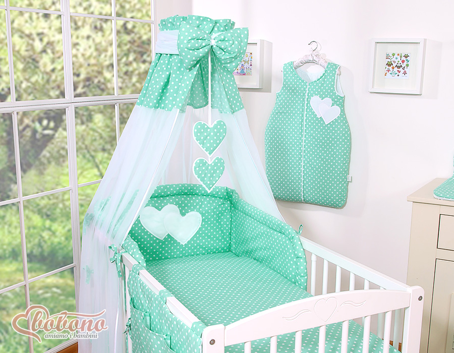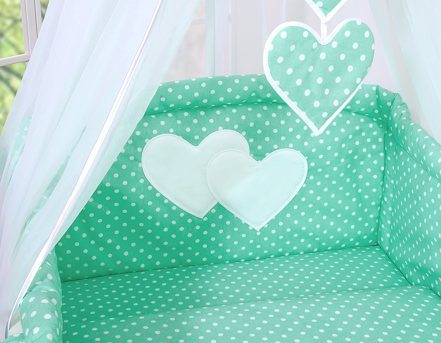Etusivu » Vuodevaatesetit pinnasänkyyn » Vuodevaatesetit Sydämet » Vuodevaatesetit pinnasänkyyn 120cm Sydämet » 7-os Pussilakanasetti pinnasänkyyn Katosverho Sydämet » 7-osainen pussilakanasetti ja katosverho - Hanging Hearts Minttu