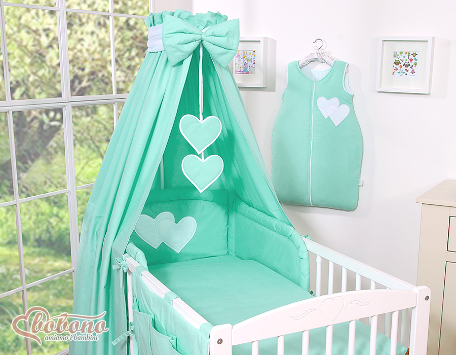 Etusivu » Vuodevaatesetit pinnasänkyyn » Vuodevaatesetit Sydämet » Vuodevaatesetit pinnasänkyyn 120cm Sydämet » 7-os Pussilakanasetti pinnasänkyyn Katosverho Sydämet » 7-osainen pussilakanasetti ja katosverho - Hanging Hearts Minttu
