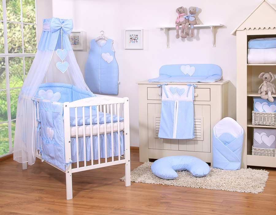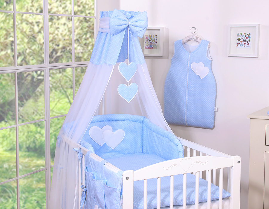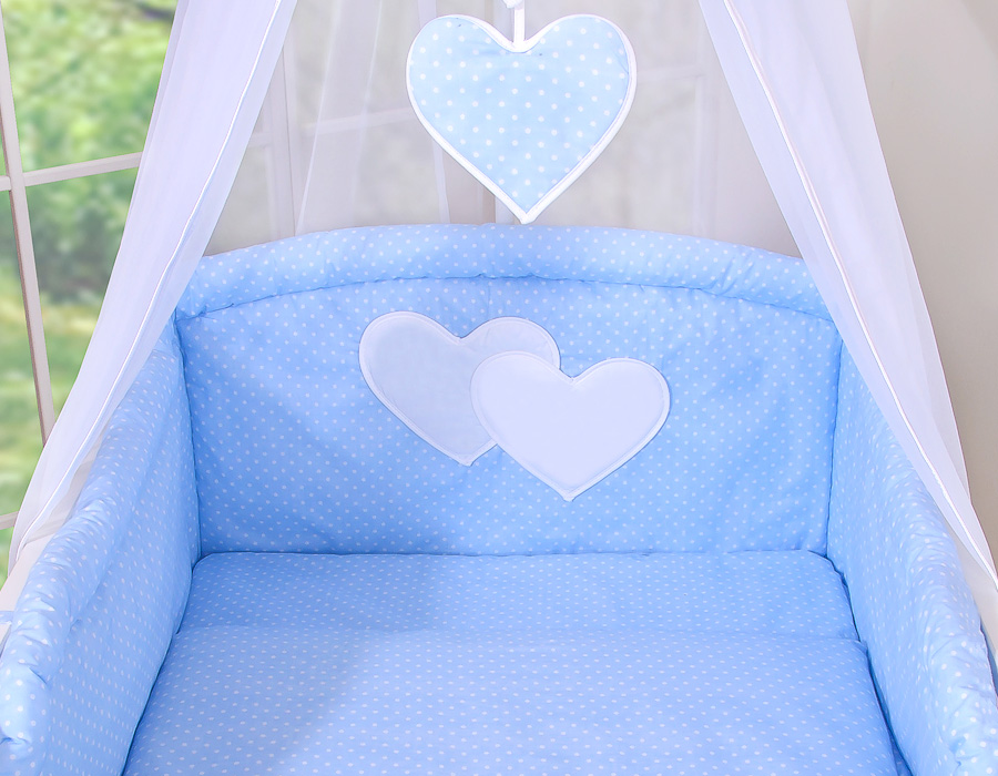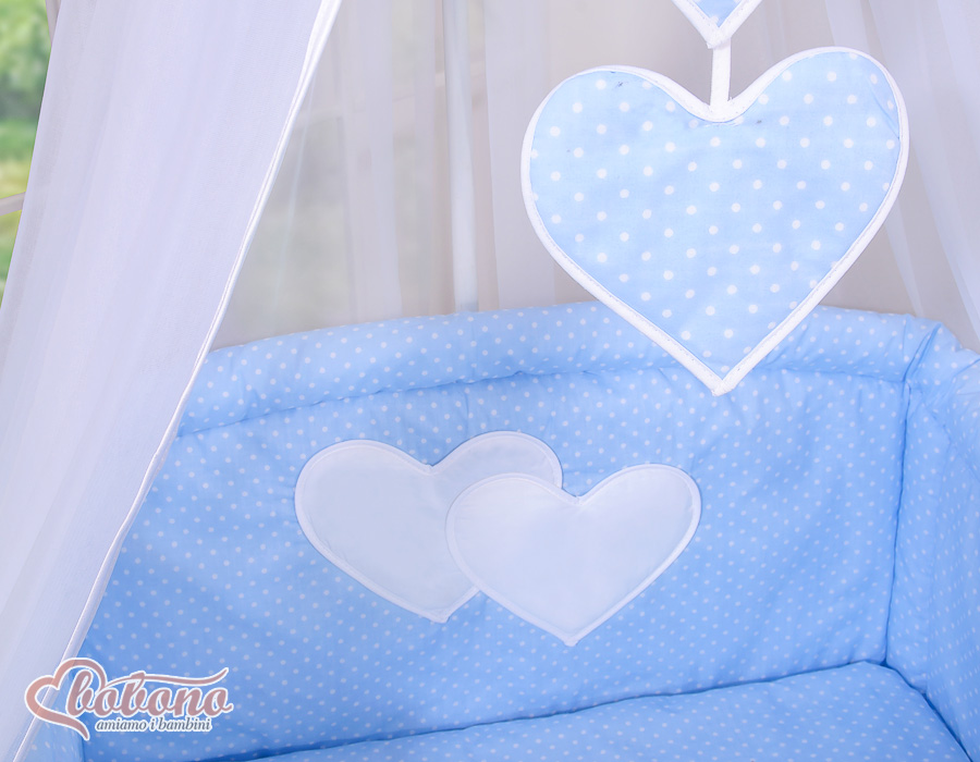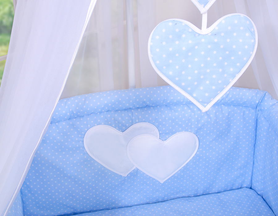 Etusivu » Vuodevaatesetit pinnasänkyyn » Vuodevaatesetit Sydämet » Vuodevaatesetit pinnasänkyyn 120cm Sydämet » 7-os Pussilakanasetti pinnasänkyyn Katosverho Sydämet » 7-osainen pussilakanasetti ja katosverho - Hanging Hearts Sininen Valkoisilla Pilkuilla