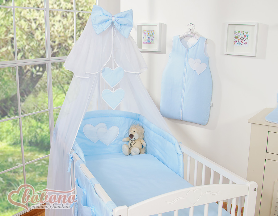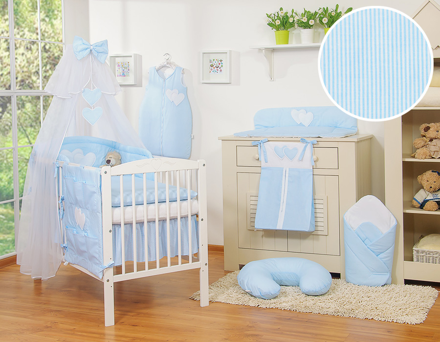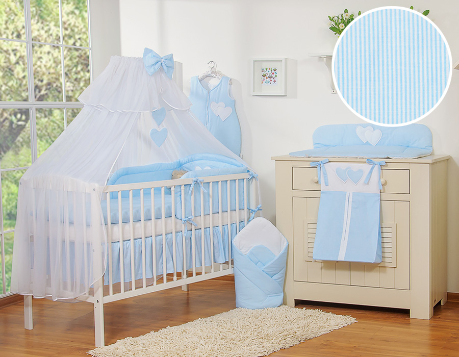 7-osainen vauvan pussilakanasetti ja hyttysverkko - Hanging Hearts Sininen Raidat