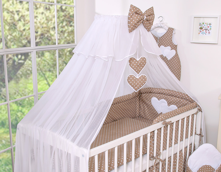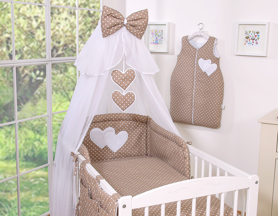 7-osainen vauvan pussilakanasetti ja hyttysverkko - Hanging Hearts Valkoisilla Pilkuilla
