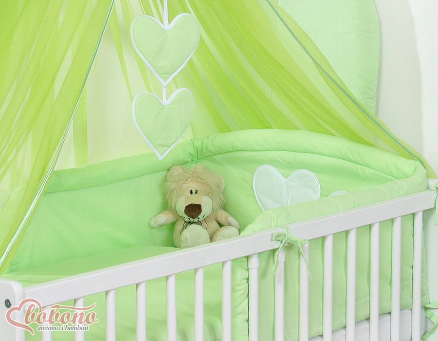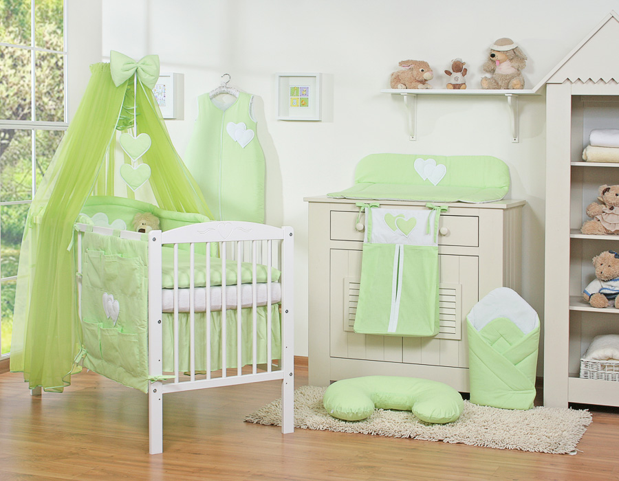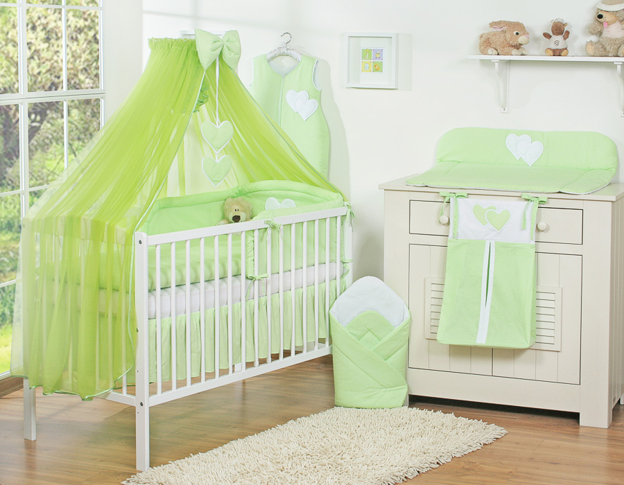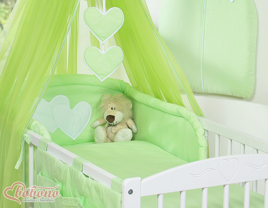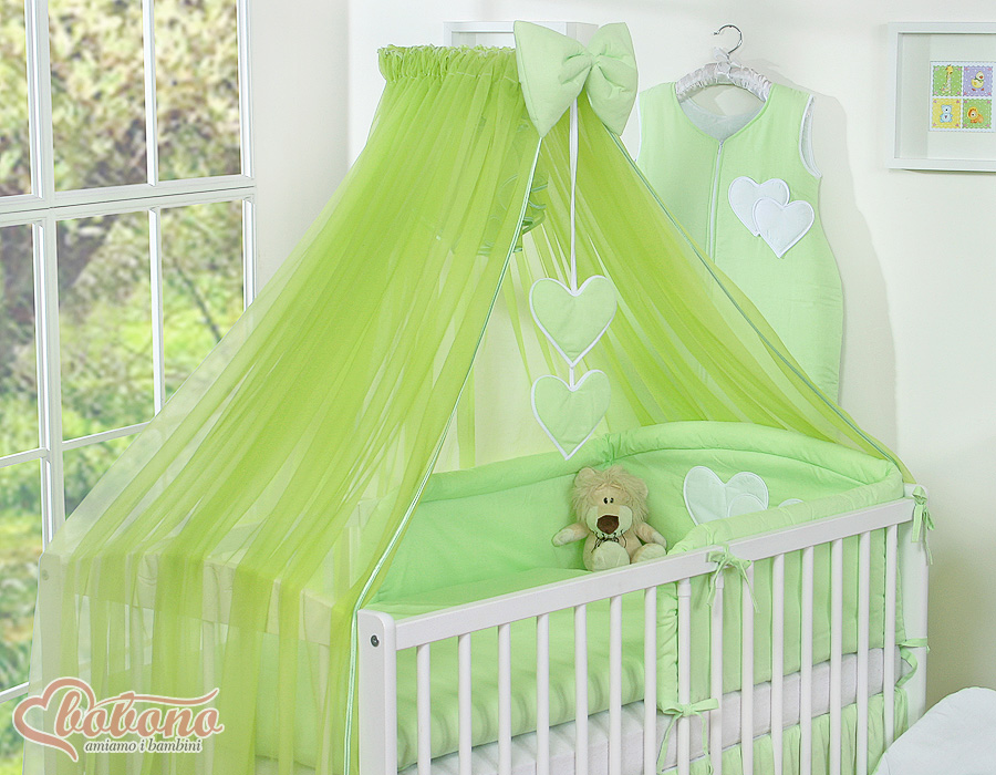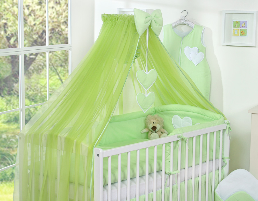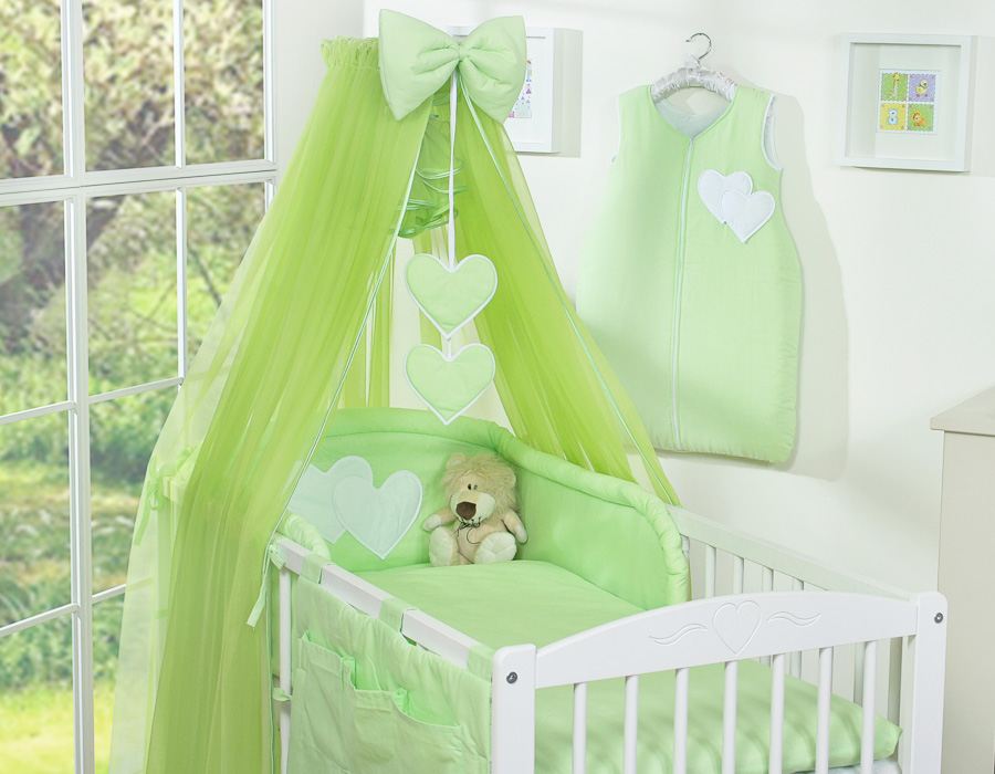 7-osainen vauvan pussilakanasetti ja hyttysverkko - Hanging Hearts Vihreä
