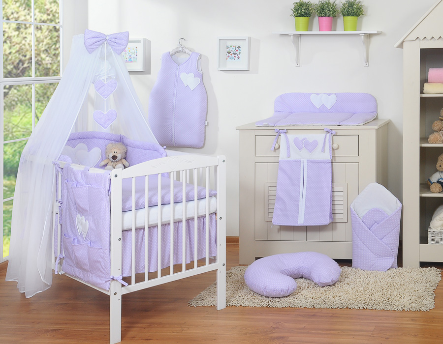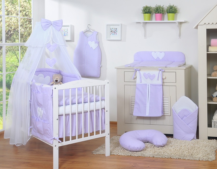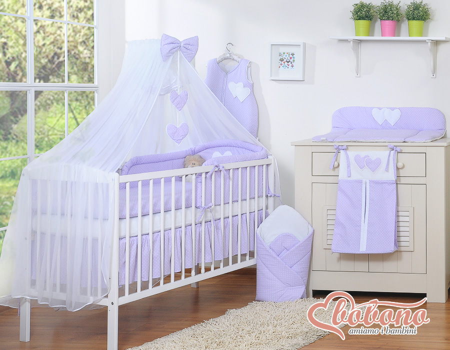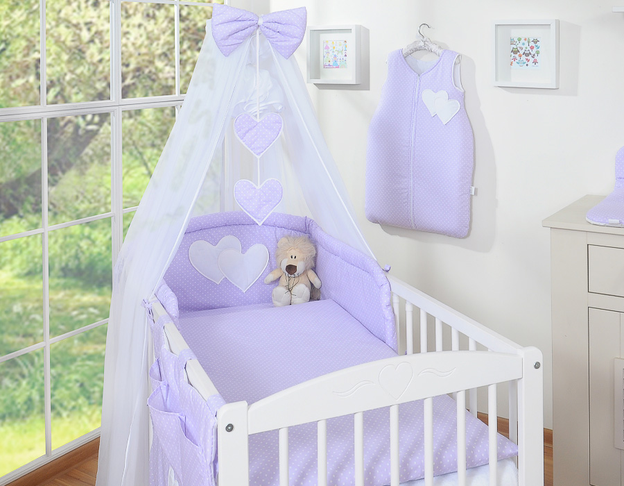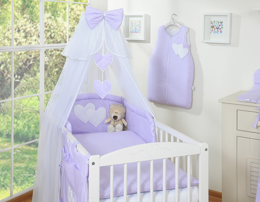 7-osainen vauvan pussilakanasetti ja hyttysverkko - Hanging Hearts Violetti Valkoisilla Pilkuilla