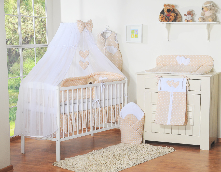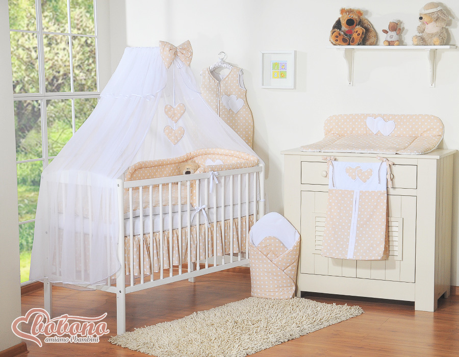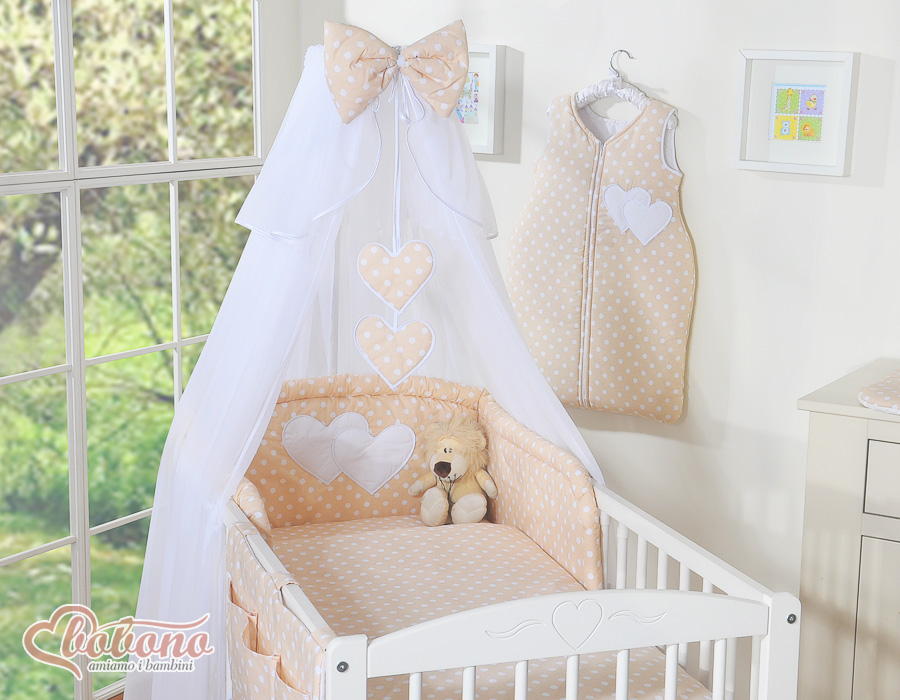 7-osainen vuodevaatesetti vauvalle + katosverho - Hanging Hearts