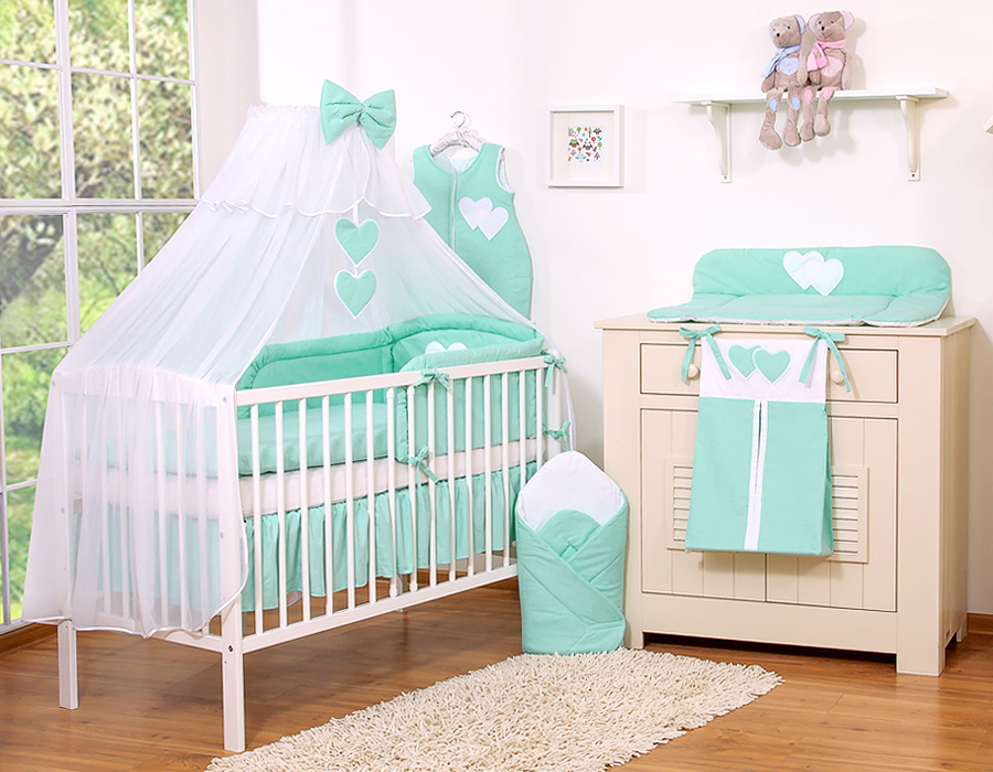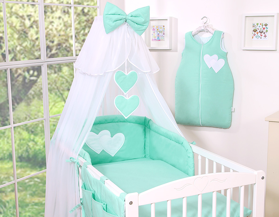 7-osainen vauvan vuodevaatesetti + katosverho - Leijuvat Sydämet Minttu