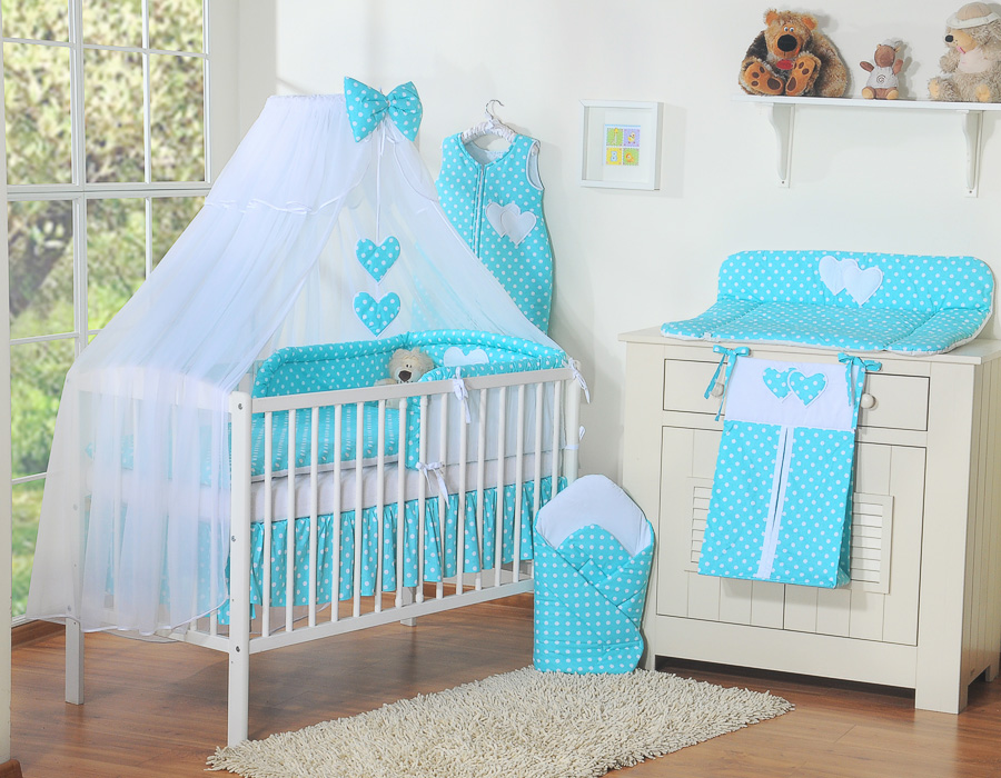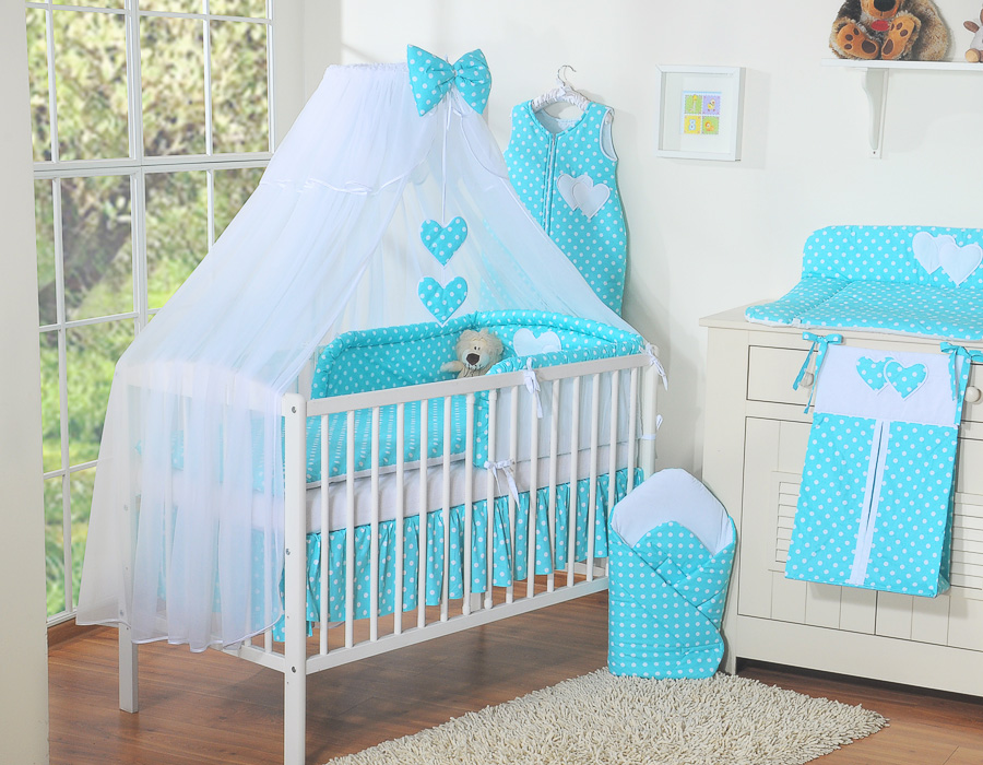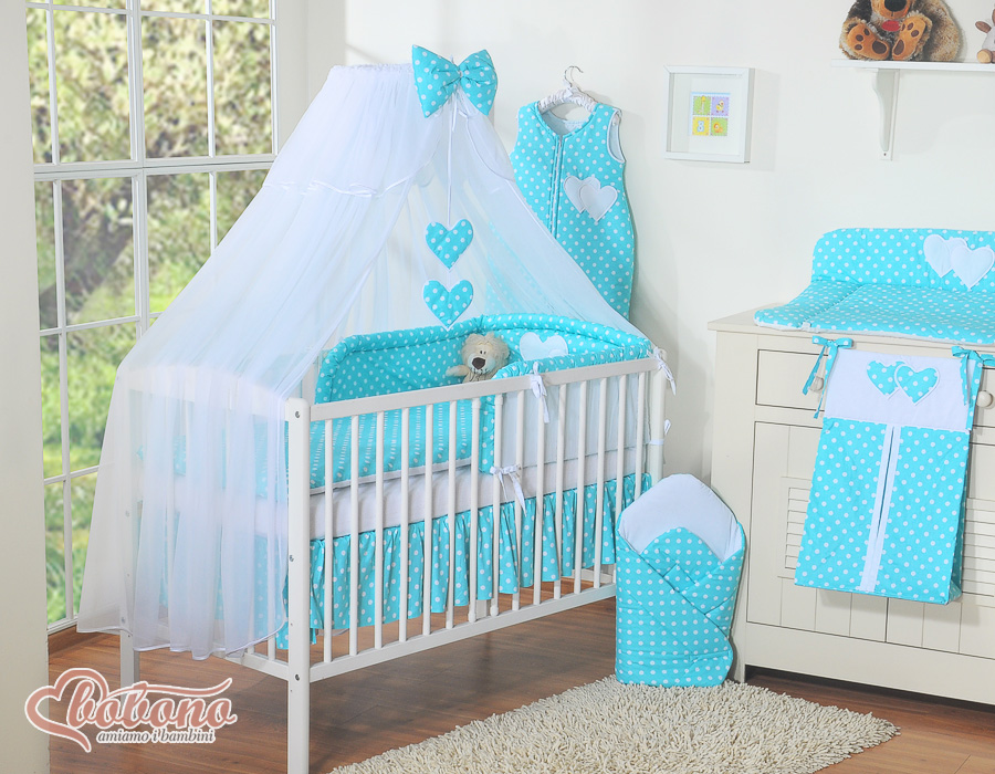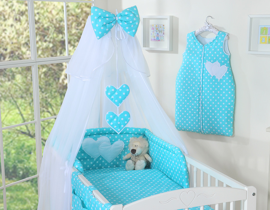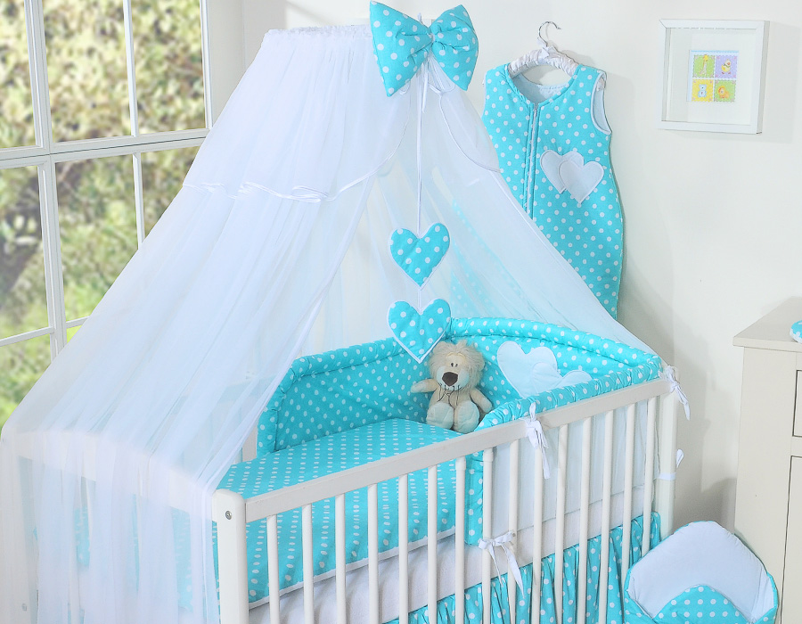 7-osainen vuodevaatesetti vauvalle + katosverho - Hanging Hearts