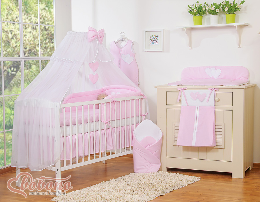 7-osainen vauvan vuodevaatesetti + katosverho - Leijuvat Sydämet Vaaleanpunainen Raidat