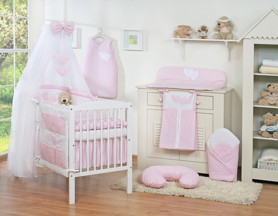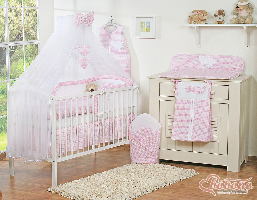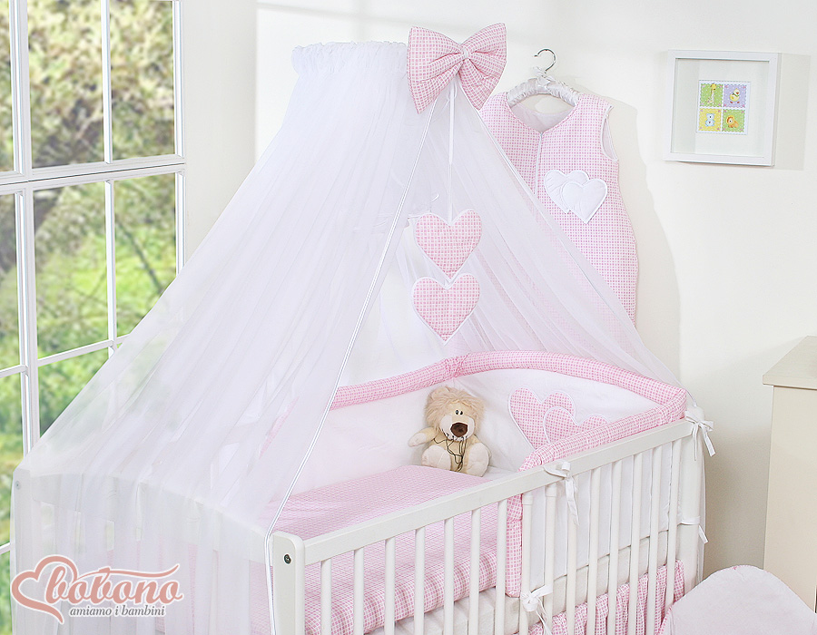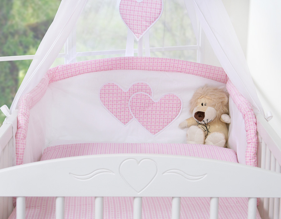 7-osainen vauvan vuodevaatesetti + katosverho - Leijuvat Sydämet Vaaleanpunainen Ruutukuvio