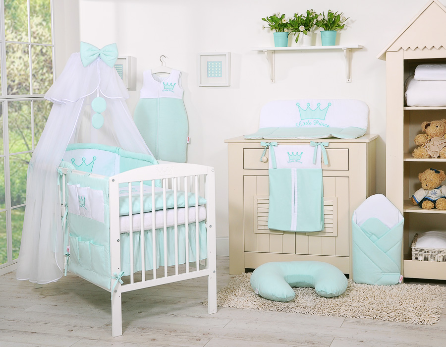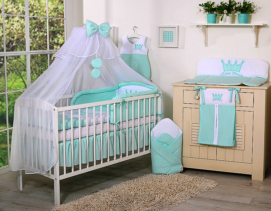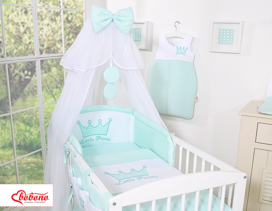 Etusivu » Vuodevaatesetit pinnasänkyyn » Vuodevaatesetit Little Prince/Princess » Vuodevaatesetit pinnasänkyyn 120cm » 7-os Pussilakanasetti Hyttysverkko Pinnasänkyyn » 7-osainen vauvan vuodevaatesetti + katosverho - Little Prince/Princess Minttu